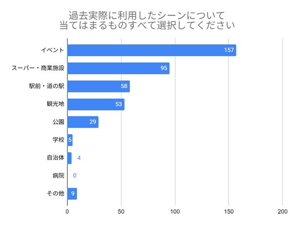 アンケート結果から、キッチンカーが最も多く利用されているのは「イベント」であり、157票を集めています。
