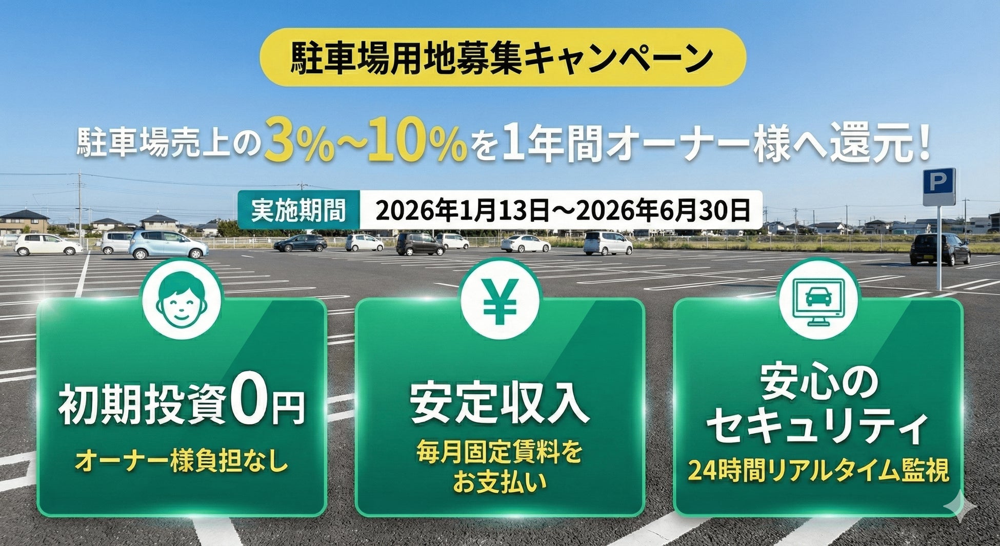 DENNOU PARKでは、駐車場用地を積極的に募集しております。キャンペーン期間中にご契約いただいた土地オーナー様には、賃料に加え、売上の一部を上乗せでお支払いさせていただきます。