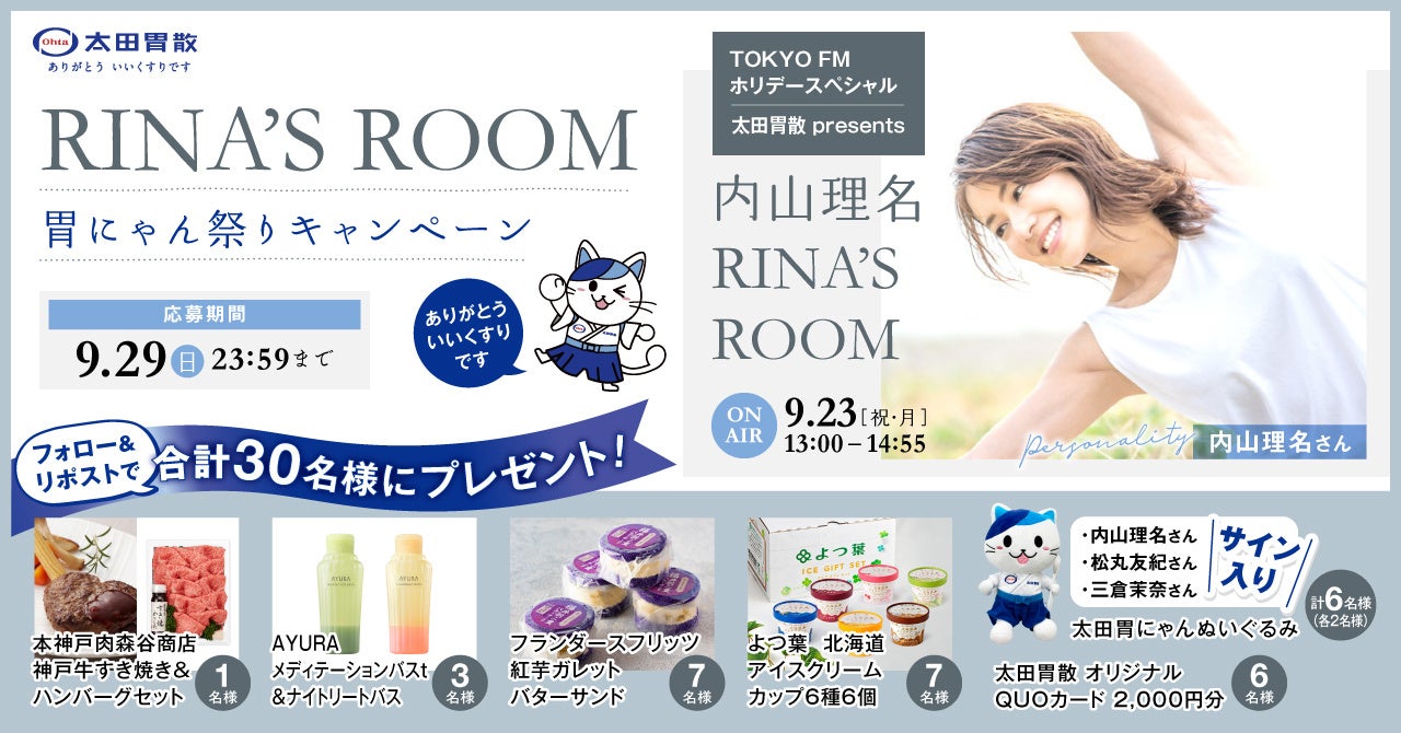 本キャンペーンは同社が提供している9月23日(祝・月)13:00~OAの「TOKYO FM ホリデースペシャル『太田胃散 presents 内山理名 RINA’S ROOM』」とのコラボ企画となっておりますので、ぜひ番組もお聴きください。