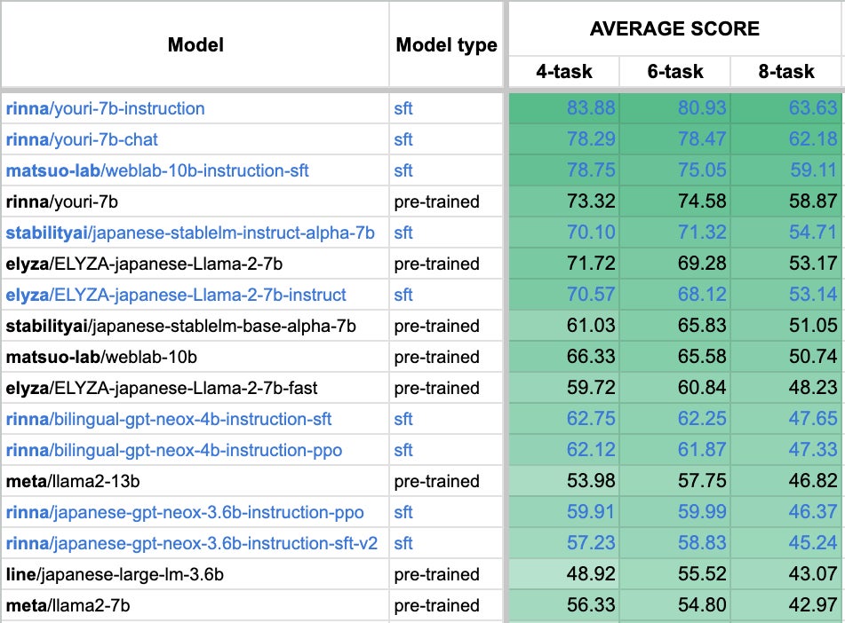 図1:日本語言語モデルベンチマークStability-AI/lm-evaluation-harnessのスコア