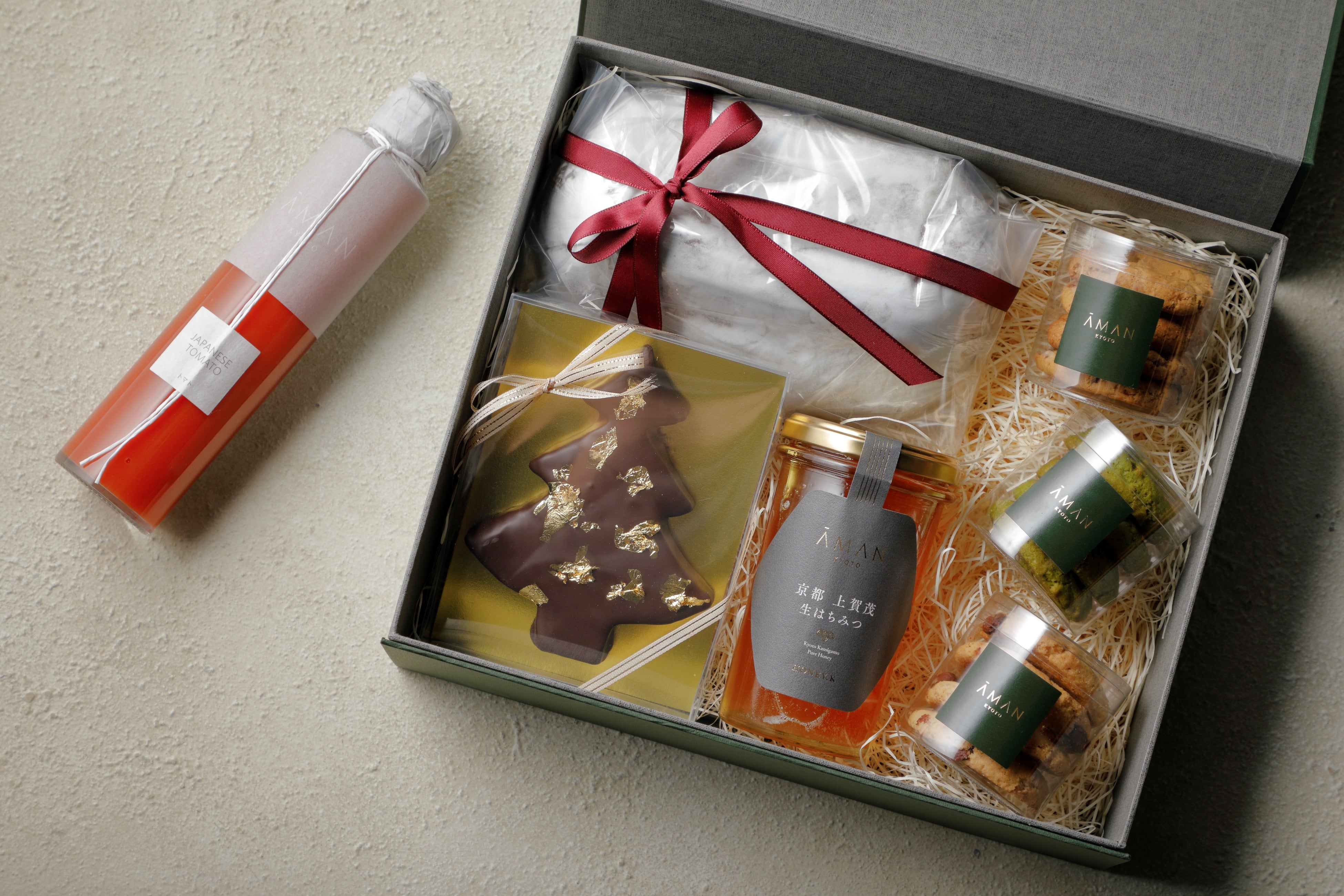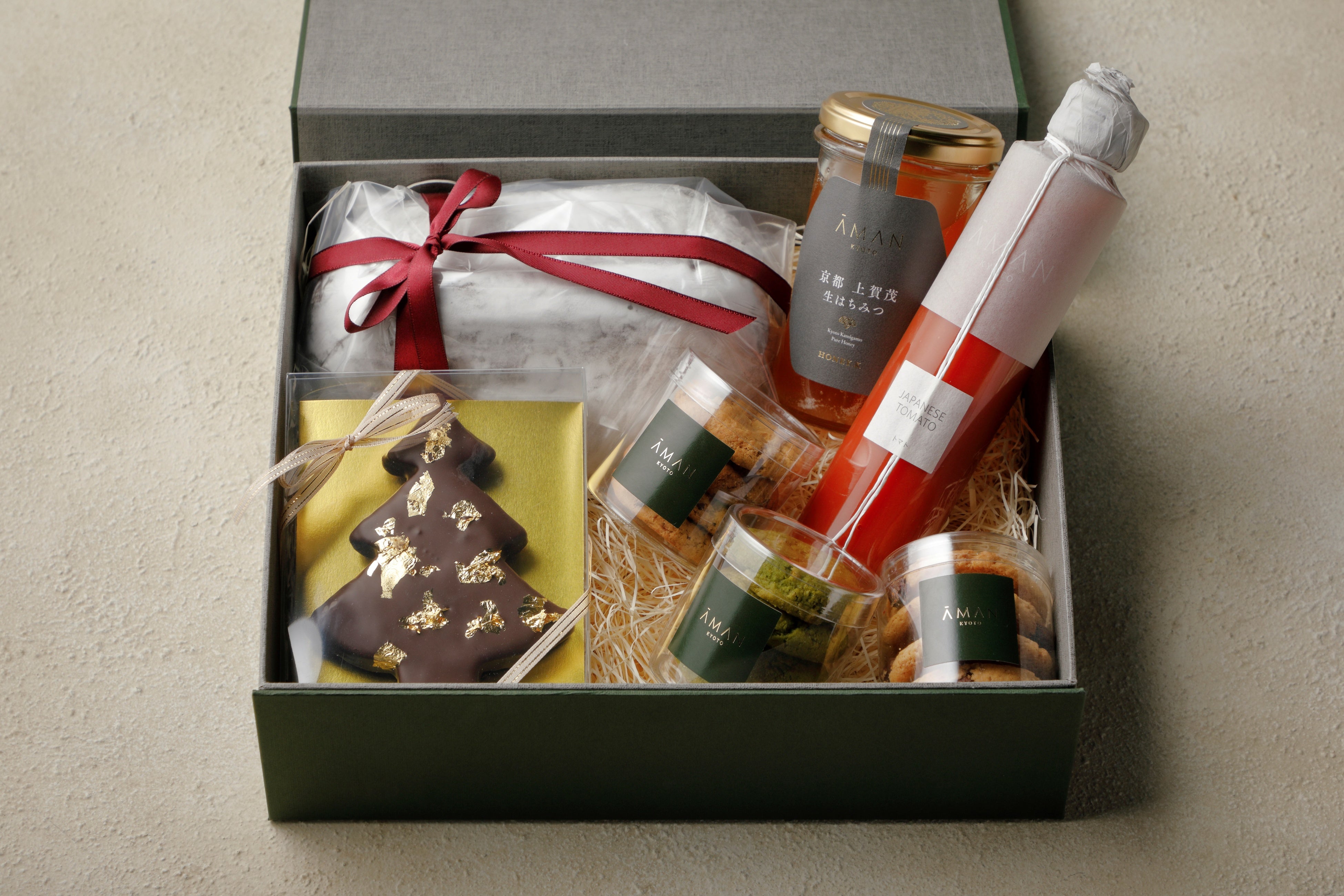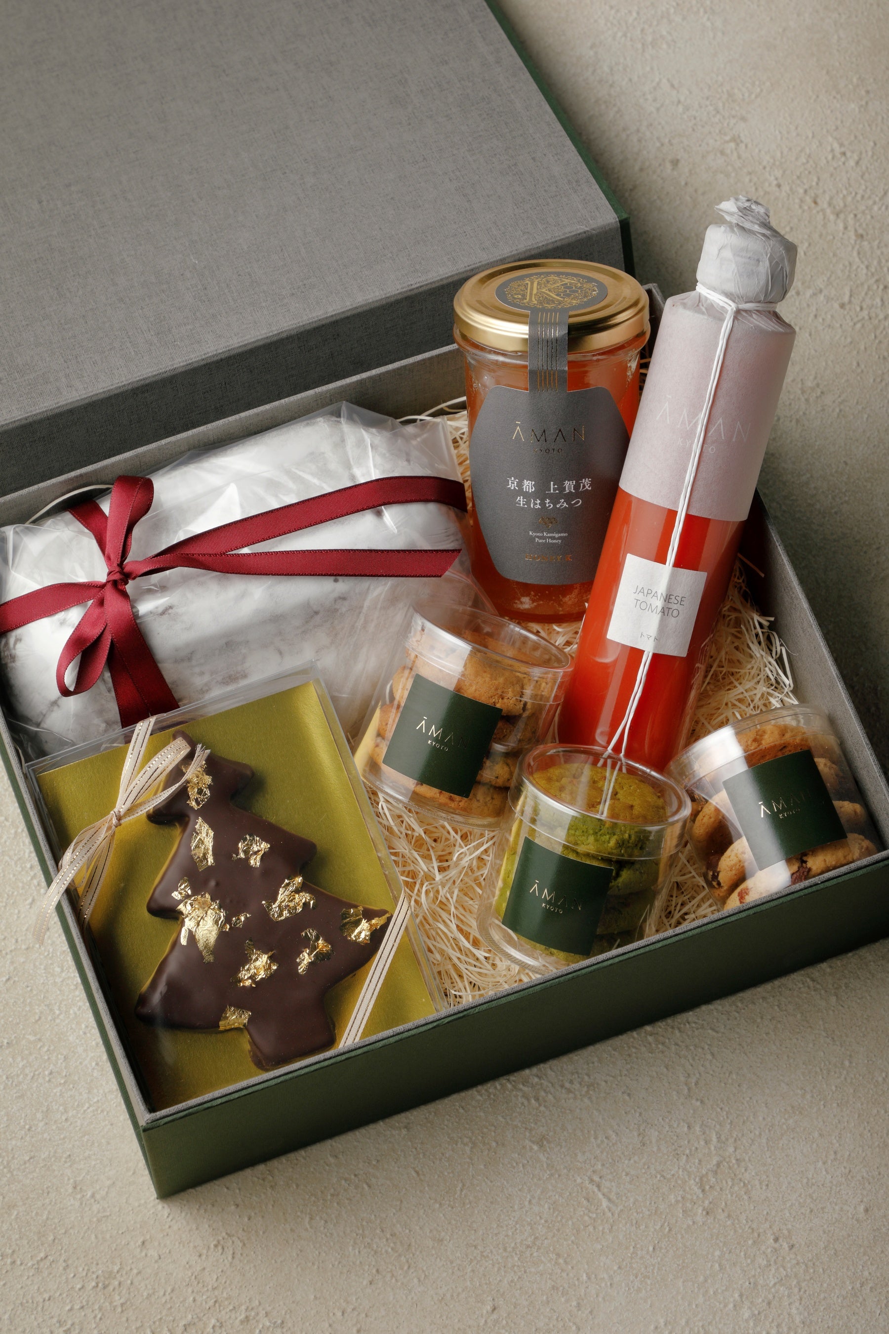 他には、100%プラントベースの素材を使い、京都のエッセンスを合わせた3種のオリジナル「ヴィーガンクッキー」、クリスマス気分を盛り上げてくれる愛らしい「クリマスツリークッキー」、自然豊かな京都・上賀茂の野山や畑でのびのびと育つミツバチにより集められた香り高くコク深い「上賀茂 生はちみつ」、そして「アマン京都オリジナルジュース」をお詰めいたしました。今年一年お世話になった方や、遠方にお住いの大切な方への贈りものにもおすすめです。