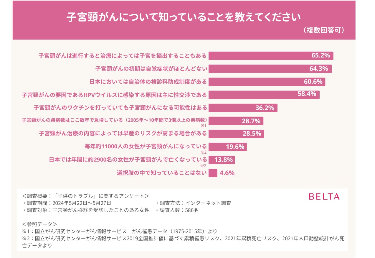 子宮頸がんに関する様々な知識について聞いたところ『子宮頸がんは進行すると治療によっては子宮を摘出することもある』ということを知っている人が65.2%と最も多く、一方で最も知っている人が少ない知識は『日本では年間に約3000名の女性が子宮頸がんで亡くなっている(13.8%)』ということでした。