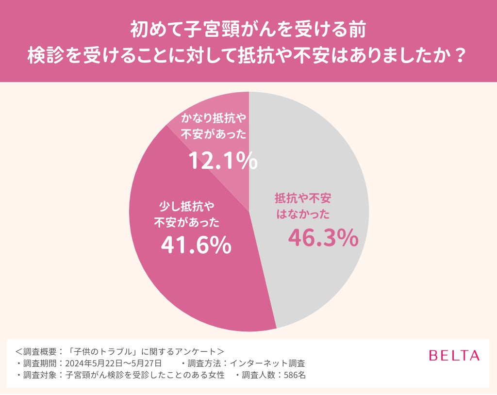 「初めて子宮頸がん検診を受ける前、検診を受けることに対して抵抗や不安はありましたか?」という質問に対して、『少し抵抗や不安があった』『かなり抵抗や不安があった』と回答した人は53.7%でした。