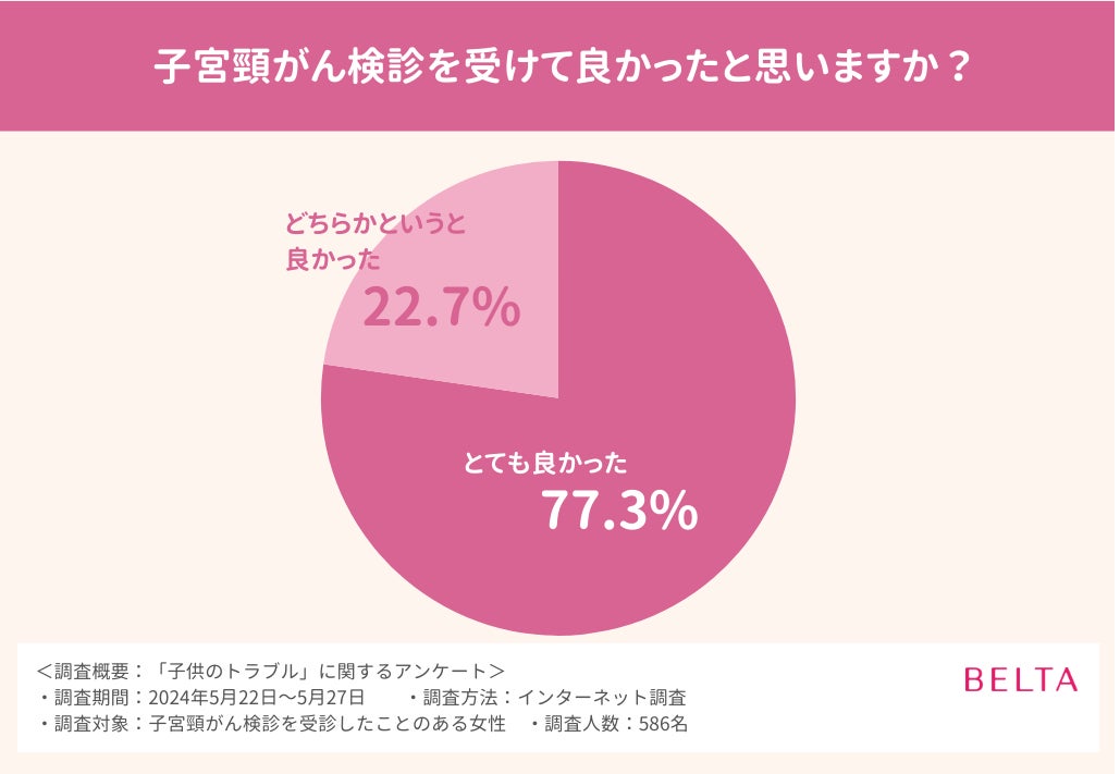 株式会社ベルタ(本社:東京都港区)が運営する女性ライフステージブランドBELTAは、子宮頸がん検診を受けたことのある586名の女性を対象に「子宮頸がん検診」に関するアンケート調査を実施いたしました。本アンケート調査を通して、子宮頸がん検診を受ける女性たちの検診前後の気持ちの変化や検診に対する考え方が明らかになりました。