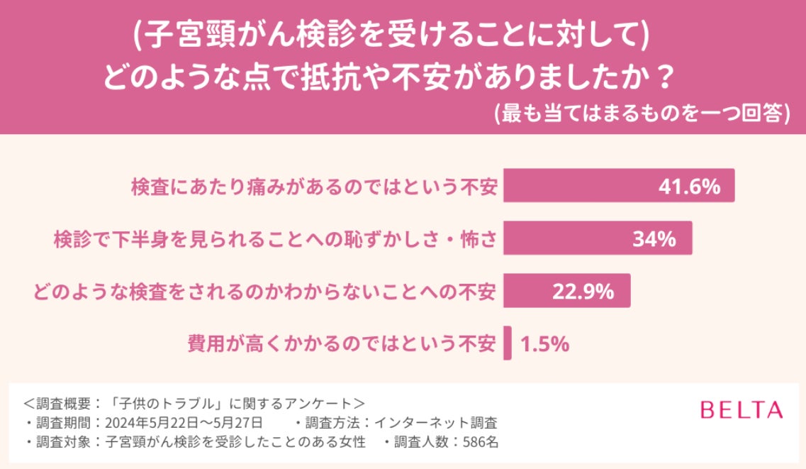 「(子宮頸がん検診を受けることに対して)どのような点で抵抗や不安がありましたか?」という質問に対して『検査にあたり痛みがあるのではという不安(41.6%)』という回答が最も多く、『検診で下半身を見られることへの恥ずかしさ・怖さ(34%)』『どのような検査をされるのかわからないことへの不安(22.9%)』『費用が高くかかるのではという不安(1.5%)』と続きました。