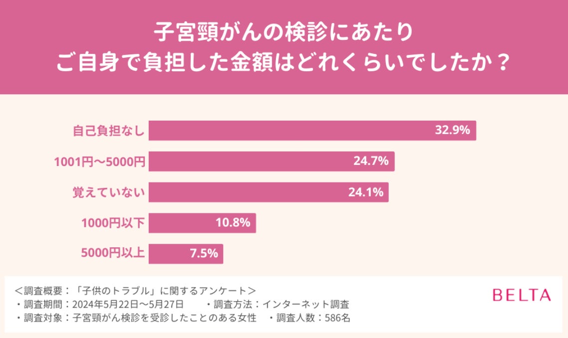 また、子宮頸がん検診を受けるにあたってかかった費用に関しては、自己負担はなかったと回答した人が32.9%、「(自己負担額)1001円〜5000円」と回答した人が24.7%と続きました。また、自治体の補助制度を活用した人は59.4%いました。
