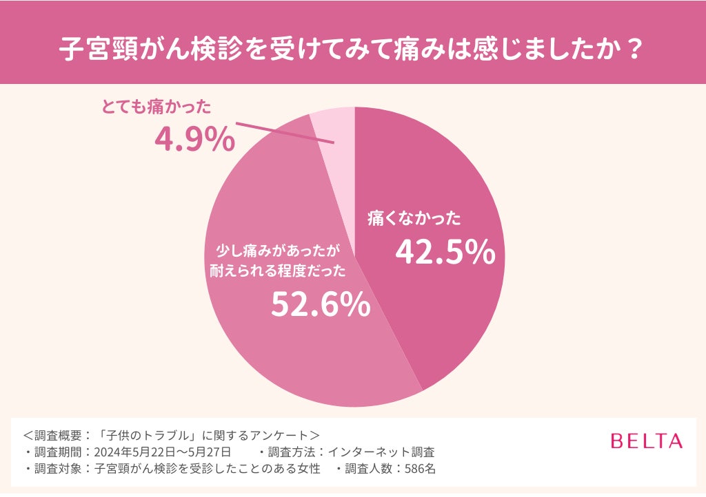 「子宮頸がん検診を受けて、痛みは感じましたか?」という質問に対して『少し痛みがあったが耐えられる程度だった(52.6%)』という回答が最も多く、『痛くなかった(42.5%)』『とても痛かった(4.9%)』と続きました。
