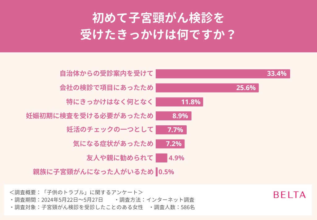 「初めて子宮頸がん検診を受けたきっかけは何ですか?」という質問に対し『自治体からの受診案内を受けて(33.4%)』という案内が最も多く、『会社の検診で項目にあったため(25.6%)』『特にきっかけはなく何となく(11.8%)』『妊娠初期に検査を受ける必要があったため(8.9%)』『妊活のチェックの一つとして(7.7%)』『気になる症状があったため(7.2%)』『友人や親に勧められて(4.9%)』『親族に子宮頸がんになった人がいるため(0.5%)』と続きました。