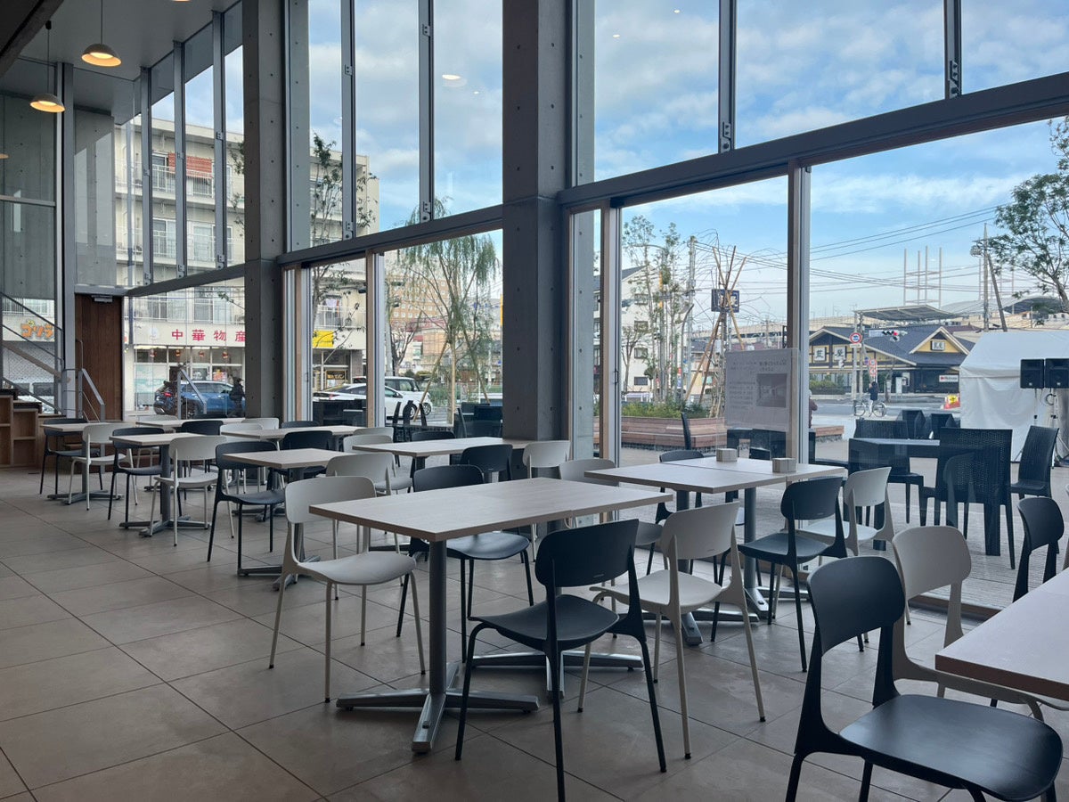 イベントスペースとなる「まちなかひろば」に面したレストラン棟に位置しており、建物内は1階と2階にテーブル席やコンセントが使用できるカウンター席が設けられております。壁に設置されたモニターでは市役所の待ち時間が確認でき、コーヒーや軽食を楽しみながらゆっくりとお待ちいただけます。休日には「まちなかひろば」でイベントが開催され、多くの市民の方で賑わうことが予想されます。開庁を前に開催された新庁舎内覧会では、平日約600名、休日約1400名の方が来庁され、『BLOOMY‘S』の店舗にも多くの方に足を運んでいただきました。来店された方からは「春日部におしゃれなカフェができて嬉しい」「酒の提供があるのでディナーに利用したい」「夜はカフェがライトアップされているおかげで通りが明るくなった」など、うれしいお声を多くいただきました。