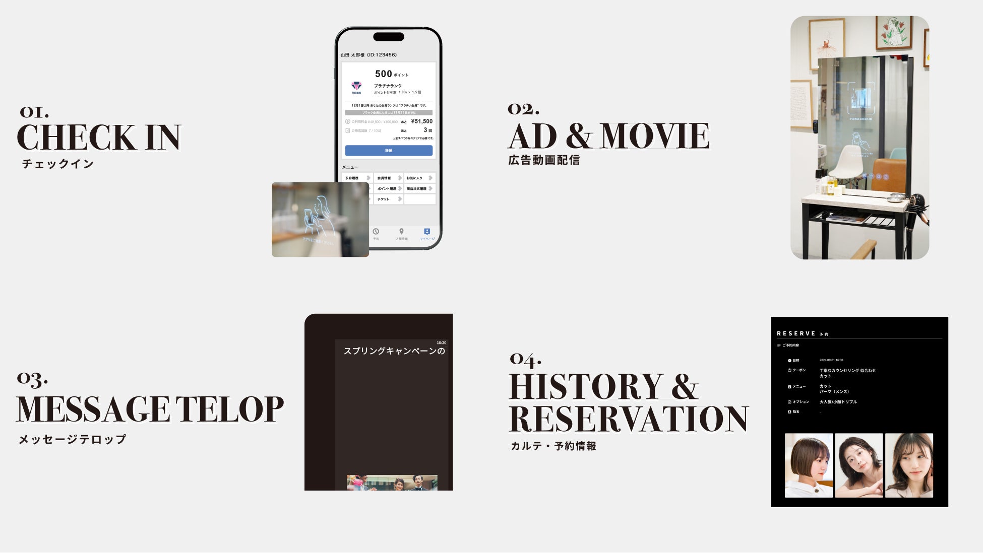 チェックイン機能により、お客様の性別や年齢、過去の施術内容や店販商品の購入履歴をもとにお客様に適した動画配信が可能となります。カットやカラーの待ち時間を効率的に活用することができます。