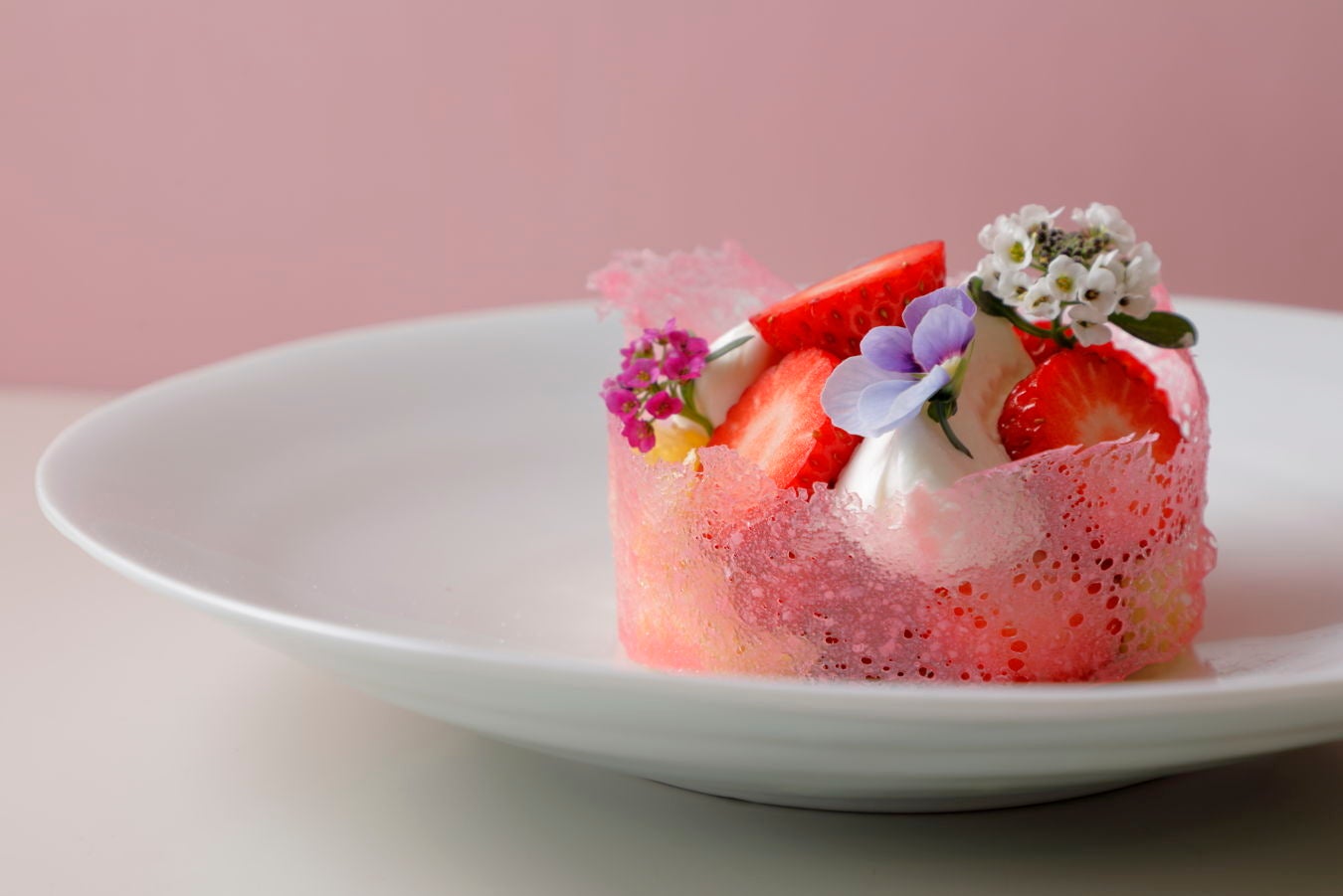 繊細な飴細工に包まれた春色のショートケーキ。エスプーマで作る軽い食感のスポンジケーキに、コク深いマスカルポーネのシャンティクリームが優しく寄り添います。鮮やかでジューシーな京都産のいちごをたっぷりとあしらい、エルダーフラワーを飾りました。愛らしくも洗練されたビジュアルと味わいに心奪われる一品です。
