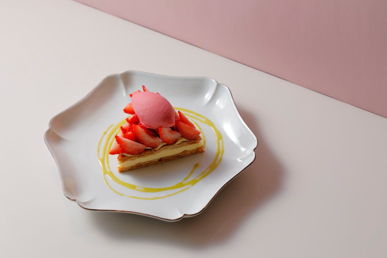 サクサクと香ばしいパイ生地に、濃厚で滑らかなカスタードクリームと芳醇なピスタチオムースが折り重なるいちごのミルフィーユ。甘酸っぱく瑞々しいいちごがたっぷりと敷き詰められ、フレッシュな味わいが口いっぱいに広がります。さっぱりとしたラズベリーソルベがアクセントとなる春を表現した味わいです。