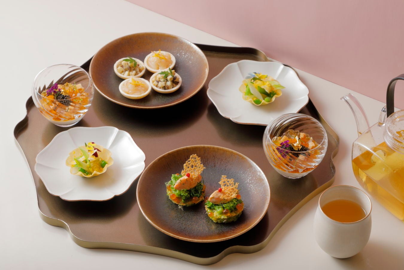 艶やかな真鍮の器に彩り豊かに盛り付けられた4種類のアソートセイボリー。新玉ねぎの甘みを引き出した「新玉ねぎのムース」は、じっくりと広がる玉ねぎの甘さが特徴の滑らかな口当たりで、ビーフコンソメのジュレの旨味とキャビアの塩気が絶妙なアクセントとなり、リッチな味わいを楽しめます。「春野菜のタルト」は、ホワイトアスパラガスやえんどう豆のピューレ、うるいなどの春野菜を、八朔と合わせてさっぱりと仕上げた、まさに春の息吹を感じさせる一品。ペアリングの華やかなカモミールの香りが、それぞれの素材の味わいに調和をもたらし、心地よい余韻を残します。