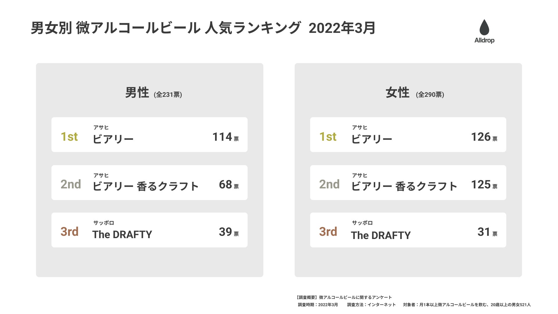 男女別では、1位から3位まではどちらも同じ順番となり、1位にビアリー、2位にビアリー 香るクラフト、3位にサッポロ The DRAFTYという結果になりました。