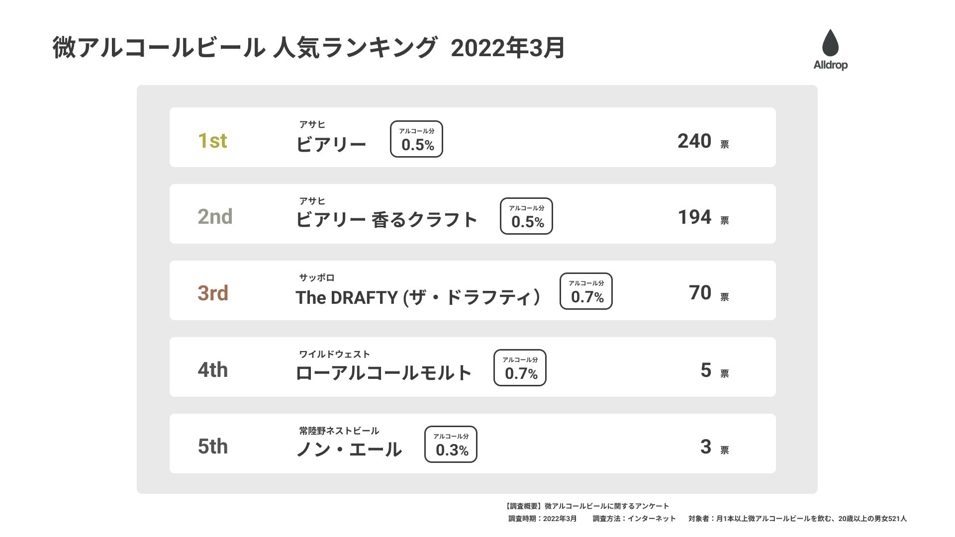 ノンアルコールビール・ローアルコールビール専門メディア「Alldrop」を運営する株式会社LANY(東京都渋谷区、代表取締役:竹内渓太)は、この度『微アルコールビール』に関するインターネット調査を実施しました。
