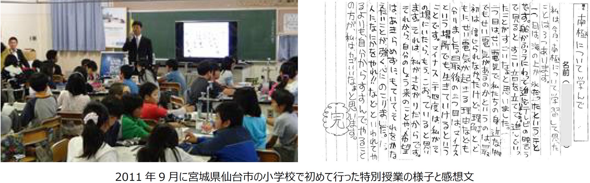 そのような中で2011年9月、ミサワホームは宮城県仙台市の2つの小学校において、地域の学校生活協同組合とともに東日本大震災を体験した子どもたちに夢を持ってもらうためのプログラムを開催。南極地域観測隊への参加経験のある社員を派遣し、極地研の協力を得て、南極を通じて地球環境を学ぶ特別授業を行いました。