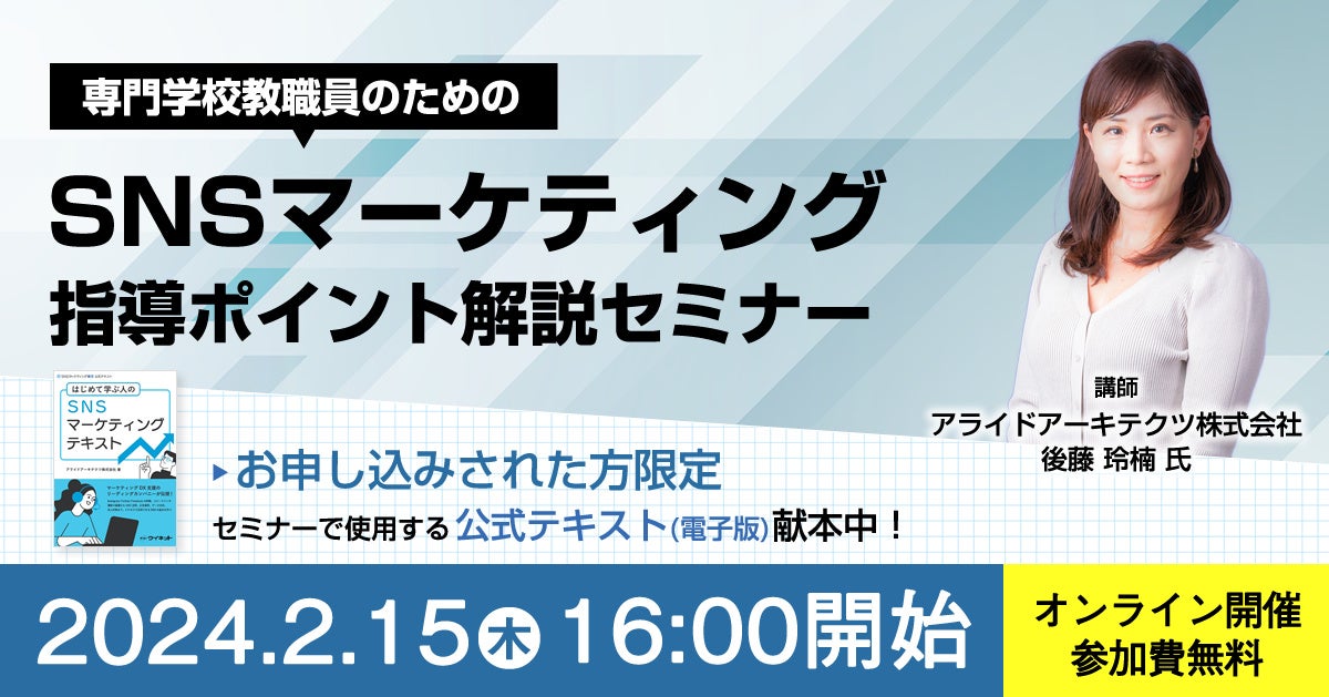 【教育機関向け 無料Web セミナー】「専門学校教職員のためのSNS マーケティングの指導ポイント解説セミナー」を2024 年2 月15 日(木)に開催いたします。