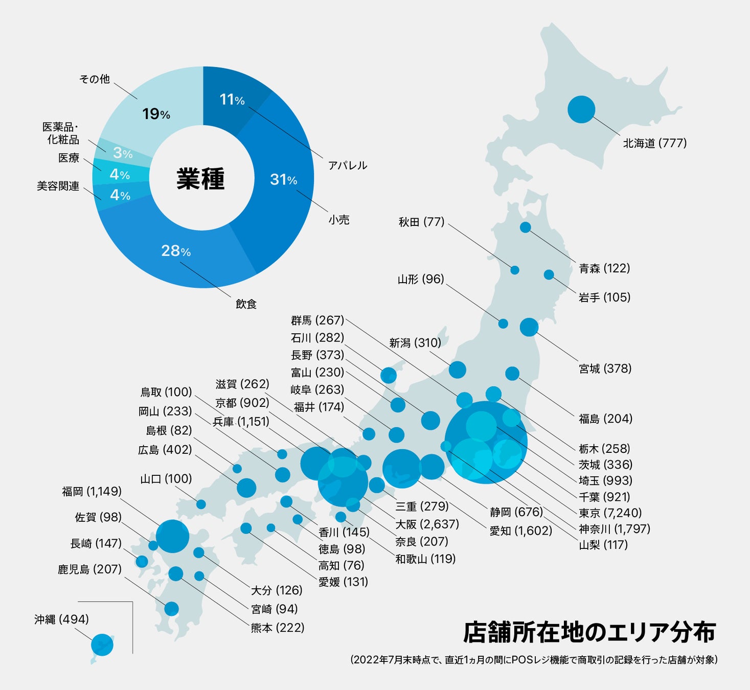 2022年7月末時点で、スマレジの登録店舗数は115,081店舗を超えました。うち、有料プランを利用している店舗は25,742店舗です。ユーザーは大きな商圏を抱える首都圏・大阪・愛知を中心に全国に広がりを見せています。