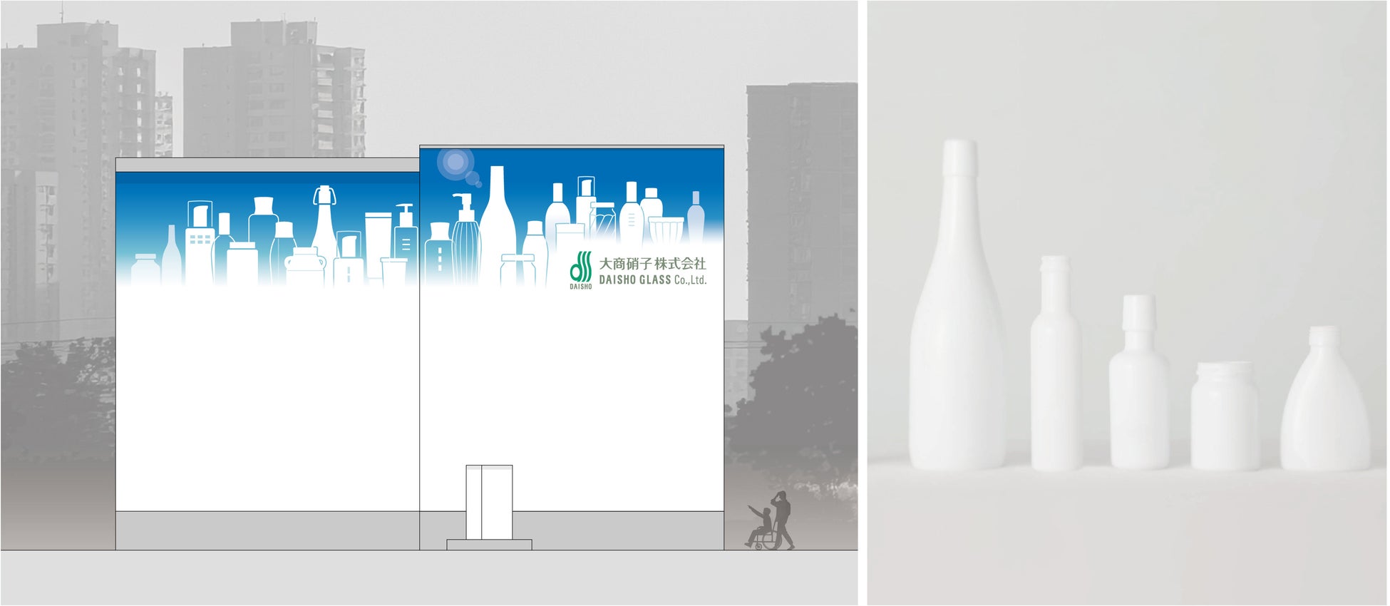 壁画はその特性上、遠くから見られるものであり、近場からはごくわずかな時間しか見られません。通行人が読み取れる情報は限られているため、明快な表現とストレートなメッセージが求められます。今回のデザインは、容器の白を際立たせる空色のグラデーションや、遠目からでも目に入るシンプルで大胆な構図により、「大商硝子とは容器を生みだす会社である」ことを真っ直ぐに伝えるとともに、記憶に残る地域の新しい風景のひとつになることも意図しています。
