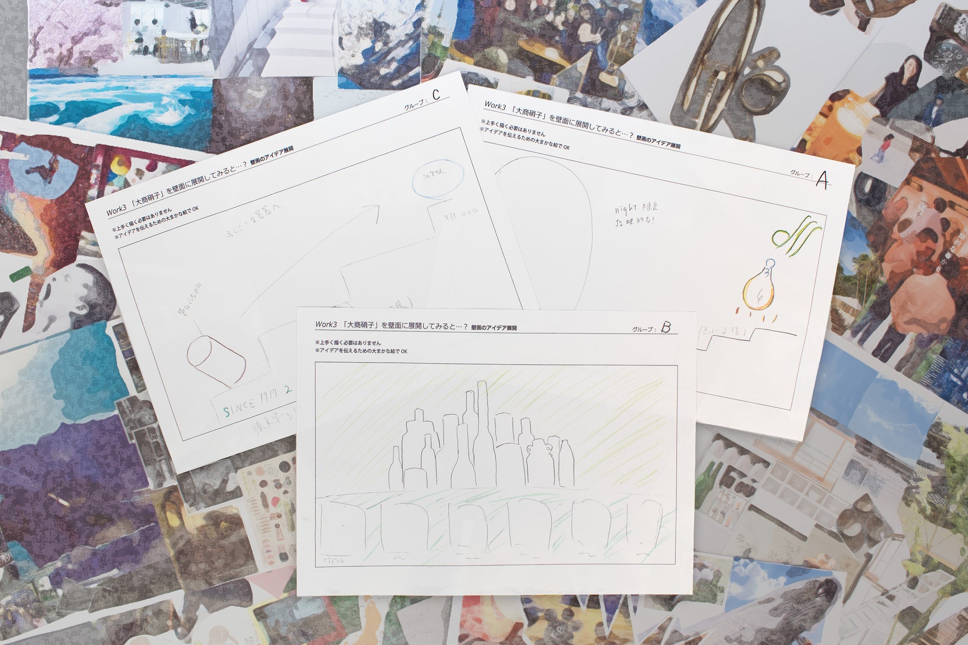 壁画を制作するにあたり、「大商硝子らしさとは何か」、「社外へどのような価値を伝えたいか」を探るため、社歴・所属部署・勤務地など多様な社員の方々に参加いただき、ワークショップを3回に分けて実施。視覚的な情報が大部分を占める壁画の特性に合わせて、ワークショップのプログラムを設計・運営しました。言葉による議論だけでなく、コラージュの技法を用いた色や形の抽出、絵を描くことを通したモチーフや構図などのアイデア発散、壁画事例から表現要素を絞り込むワークなどを盛り込むことで、共有しにくい感性面からの検討を重視した内容としました。