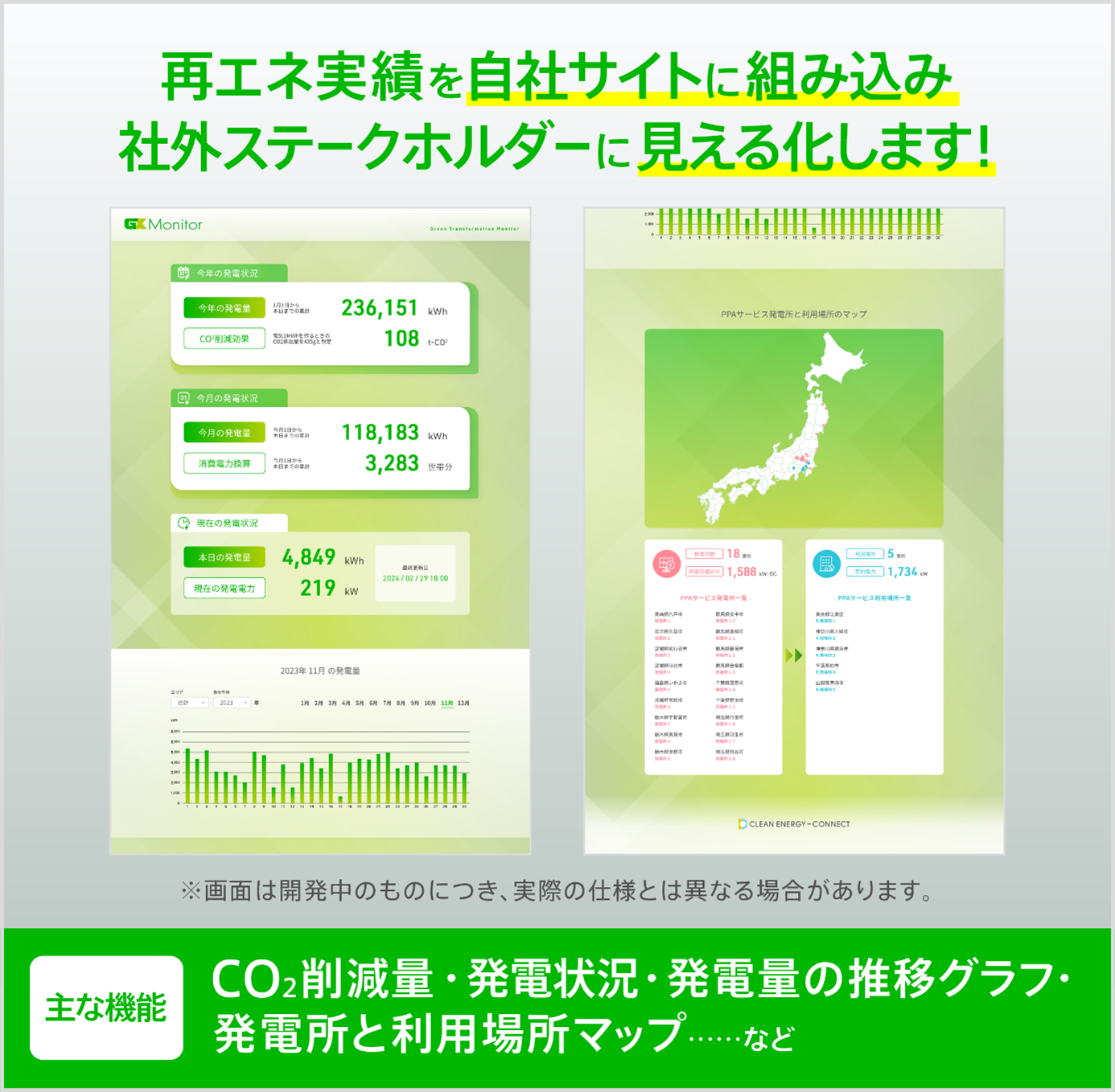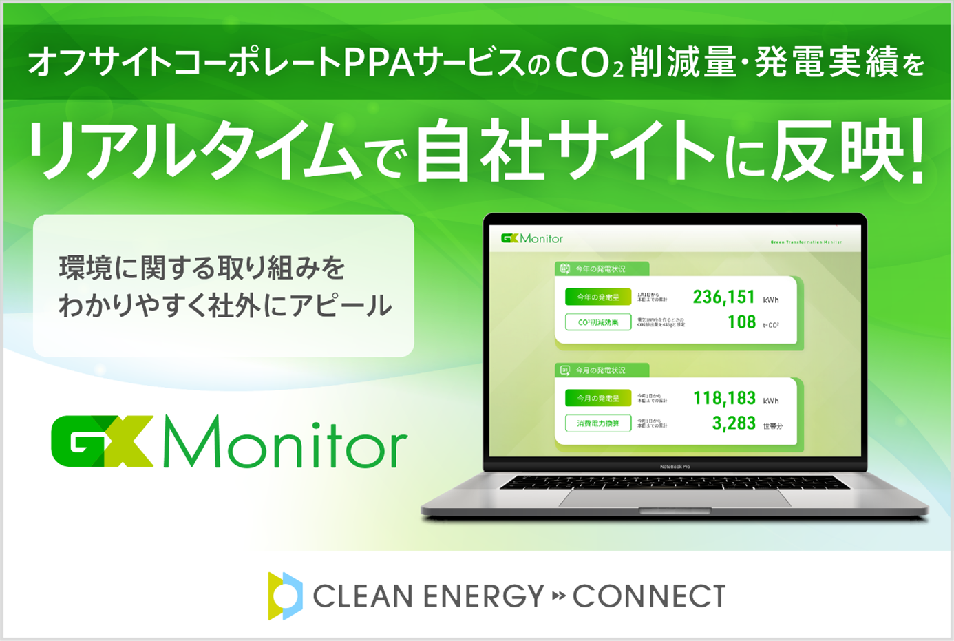 脱炭素経営企業、RE100参加企業等のお客様に対してNon-FIT太陽光発電によるグリーン電力と環境価値をお届けする株式会社クリーンエナジーコネクト(代表取締役:内田鉄平、以下「クリーンエナジーコネクト」)は、オフサイトコーポレートPPAサービスによる脱炭素の取り組みを社外ステークホルダーにPRできる「GXモニター™」のサービスを開始しましたのでお知らせします。