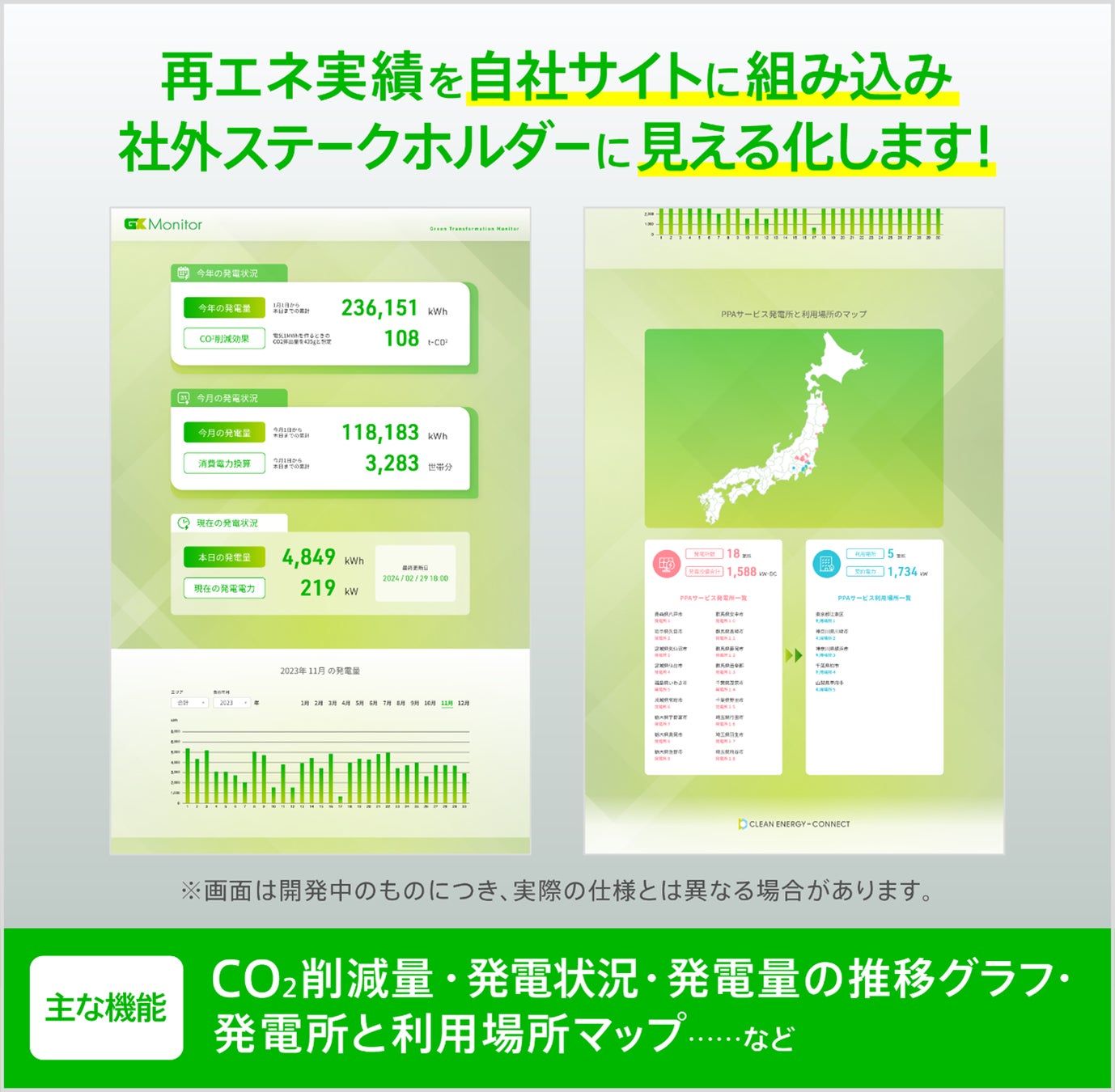 「GXモニター™」では、オフサイトコーポレートPPAサービスによるCO2削減量、発電状況等をリアルタイムで見える化し、お客様Webサイトにて、自社の再エネ導入実績等脱炭素の取り組みを社外ステークホルダーにPRすることが可能です。
