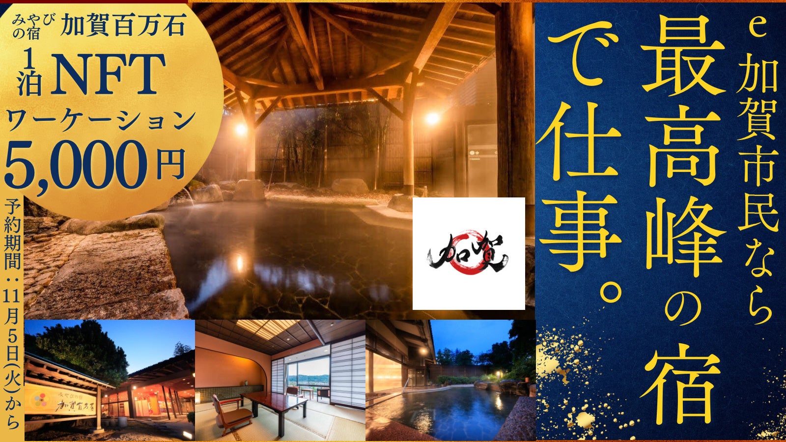 石川県加賀市(市長:宮元陸)では11月5日より、ビジネスパーソン向けにワーケーションサービスを提供します。「山代温泉 みやびの宿・加賀百万石」で希望宿泊日を予約して、e‐加賀市民証販売サイトにて5,000円で「ワーケーションNFT」を購入して、宿泊することが可能になるサービスです。室数限定、期間は令和6年12月末まで。「ワーケーションNFT」を購入いただいた方全員に、e-加賀市民証NFTもウォレットに付与されます。