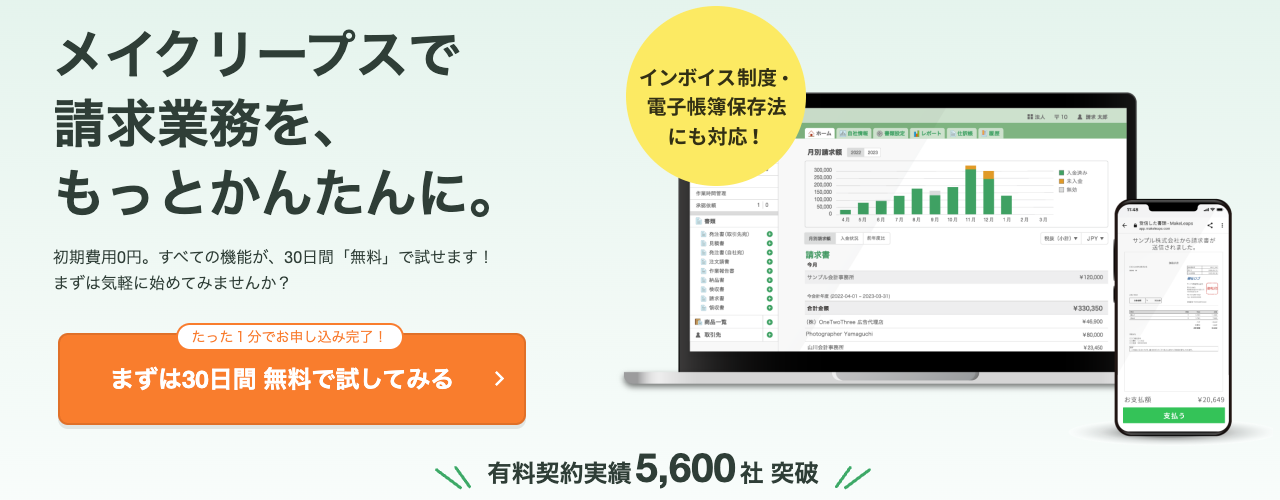 「MakeLeaps」を利用することで、今まで手作業で行っていた、印刷・封入・切手貼付・ポスト投函などの郵送に必要な一連の業務を電子送付することができ、経理担当者の工数の削減や出社の必要性を下げることができます。作成した見積書や請求書のデータは一元管理できるため、電子帳簿保存法に準じた書類の送付側の管理にも対応しています。