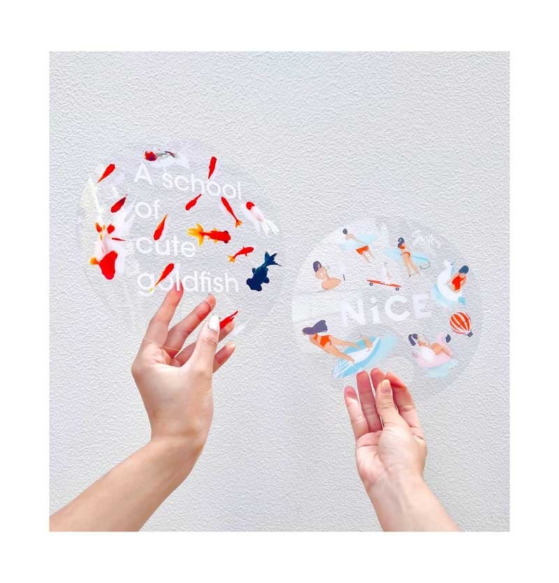 丸うちわ印刷はPET素材で作られたクリアタイプのうちわです。よくある紙製とは違い水にも強く耐久性にも優れ、長くご愛用頂けるオリジナル丸うちわです。