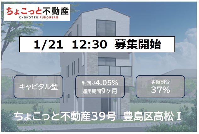 株式会社良栄(本社:東京都新宿区、代表取締役 森⽥良⼈)が運営する不動産クラウドファンディング ちょこっと不動産は、『ちょこっと不動産39号 豊島区高松Ⅰ』の概要を公開いたしました。2025年1⽉21⽇(⽕)12:30〜先着順にて募集を開始いたします。