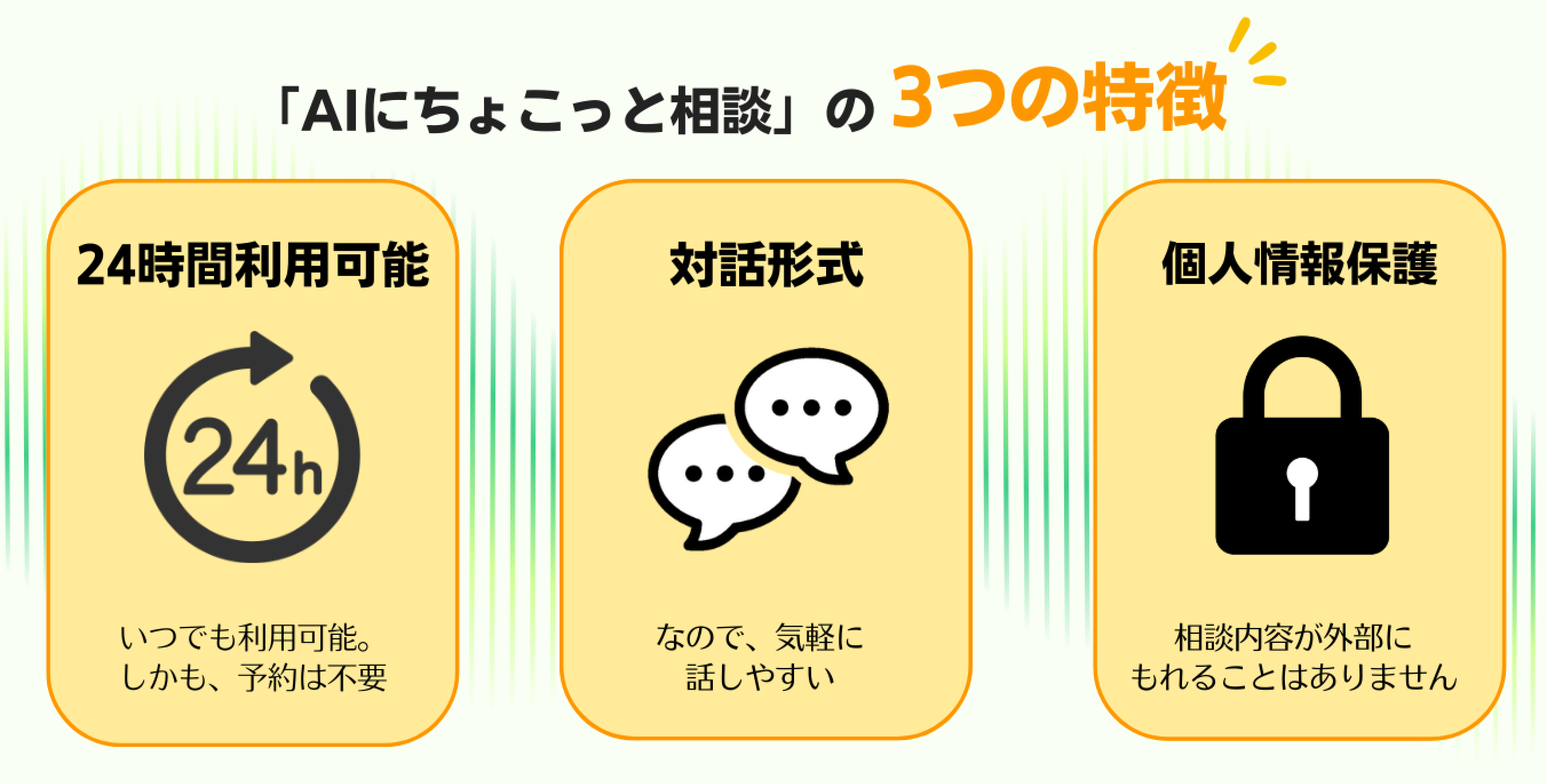 「AIにちょこっと相談」は、今ちょっと聞いてほしい、悩みを整理してもらいたい、カウンセリングでいきなり話すのはハードルが高い、といった要望に応えるサービスです。対話形式のため、チャット感覚で気軽に24時間相談いただけます。マイシェルパご利用者様は無料で利用できます。