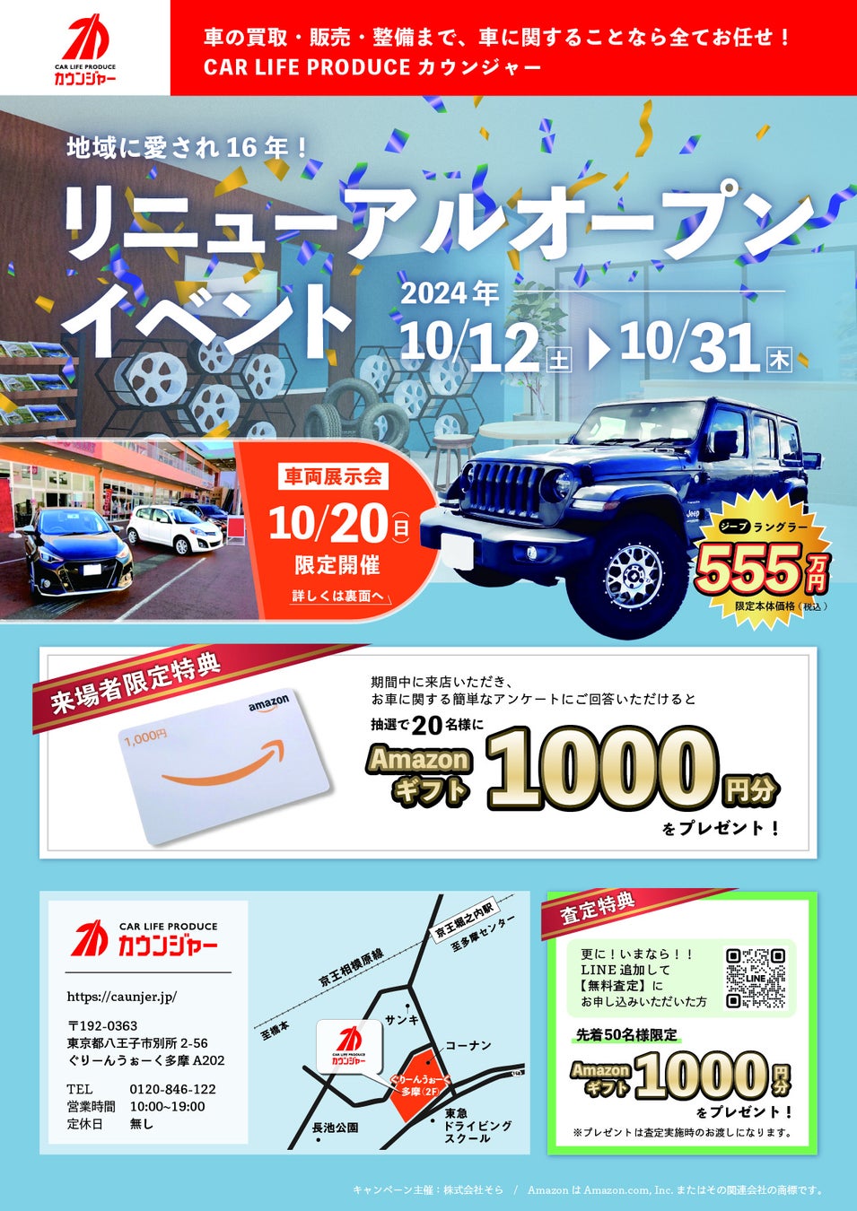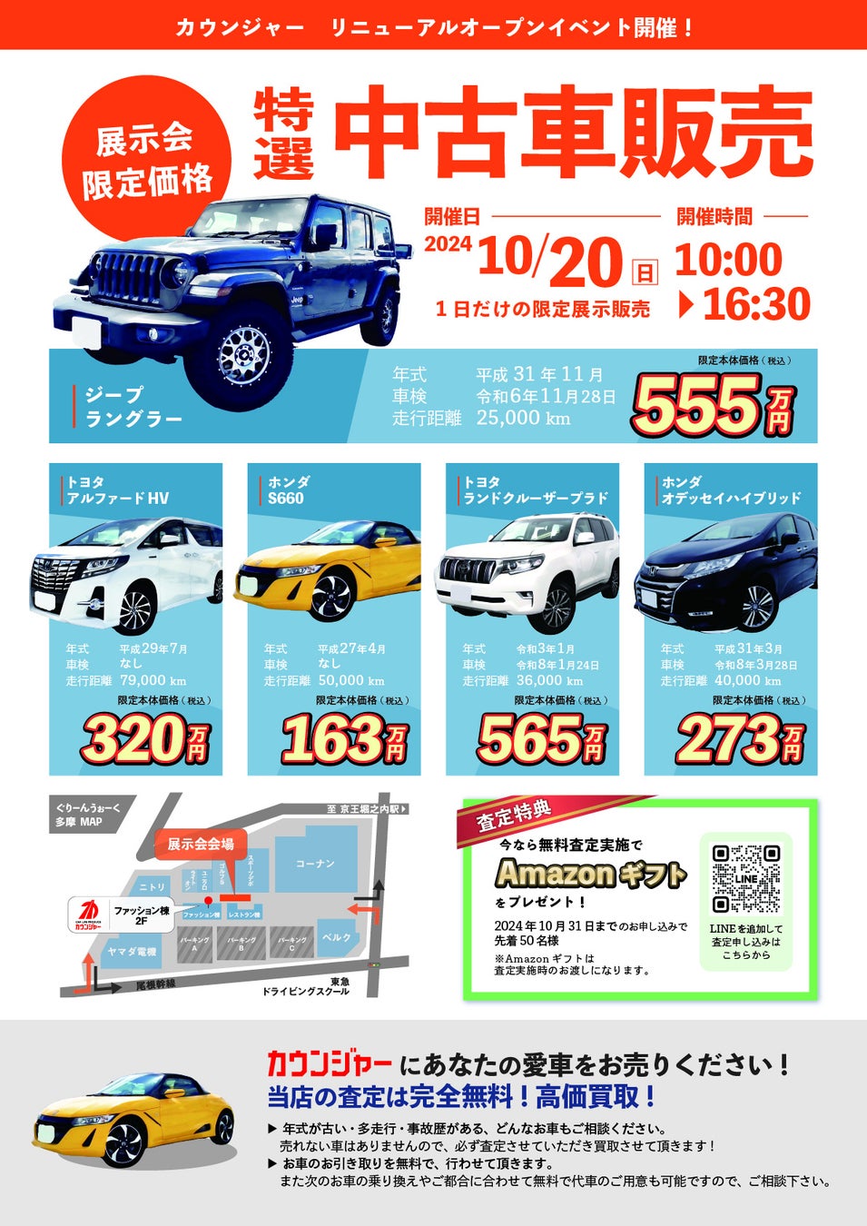リニューアルオープンを記念し10月12日~31日の間、八王子のショッピングセンター「グリーンウォーク多摩」で中古車展示会イベントを開催いたします!