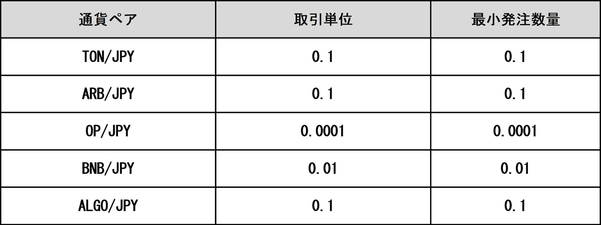 当社の提供するサービス「CoinTrade(コイントレード)」において、本日取扱い開始となるビルドアンドビルド(BNB)、トンコイン(TON)、アービトラム(ARB)、アルゴランド(ALGO)、オプティミズム(OP)の5銘柄加え、23銘柄の取扱いとなりました。
