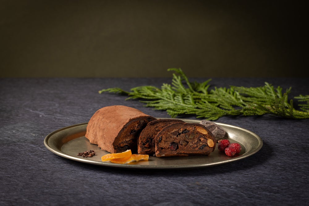 高級チョコレートで知られる、フランス産のヴァローナのチョコレートを贅沢にたっぷりと使い、熟成されたまろやかな上品な味わいのブランデー「マール」を使用した大人のためのショコラシュトレン。マールと相性の良い、ジューシーな手積みレーズン、酸味がありつつ全体のバランスと調和するドライのチェリー、クランベリー、ブルーベリーを練り込んでいます。また、アクセントにもなり、味を締める役割としてオレンジピールも加えました。生地全体をダークチョコレートでコーティングし、上からヴァローナのココアパウダー、粉糖で包み込むことで、より最初の一口目にショコラの味わいや香りを感じられる仕上がりに。冷やして食べればパリッとしたチョコの食感が楽しめ、常温に戻す中でまろやかな味わいに変化します。ホリデーシーズンには、レバームースやシャンパンと共に、魅惑の大人ショコラシュトレンをご賞味ください。