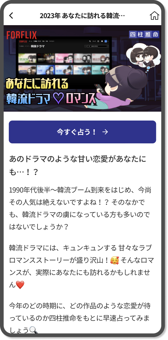 フォーステラー占いから最新無料占い「2023年 あなたに訪れる韓流ドラマ♡ロマンス」がリリースされました!