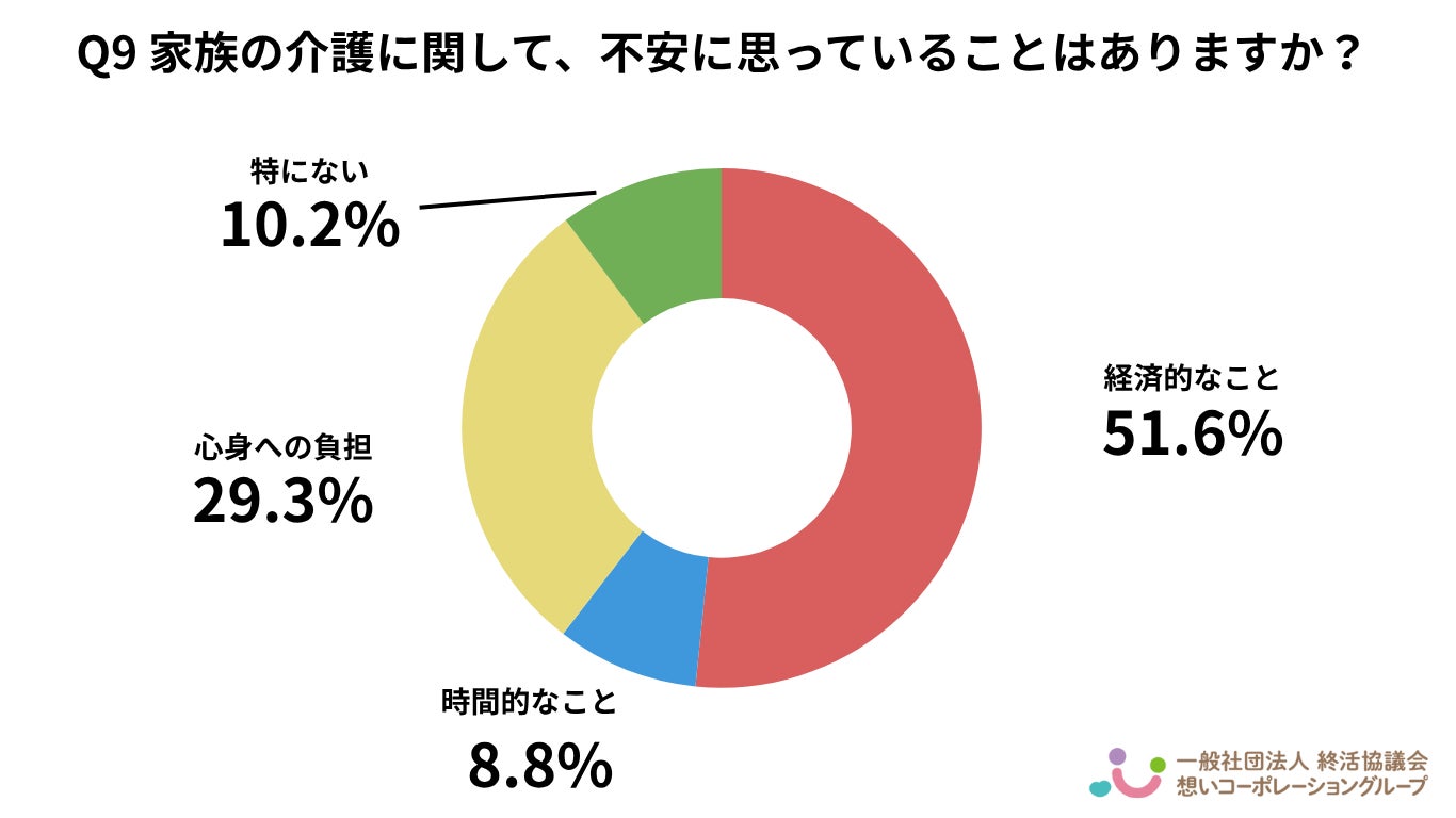 「経済的なこと」が51.6%と半数を超え、最も大きな不安要素となっています。「心身への負担」も29.3%と高く、介護に伴う金銭面・心理面の負担感が主要な懸念点であることがわかります。
