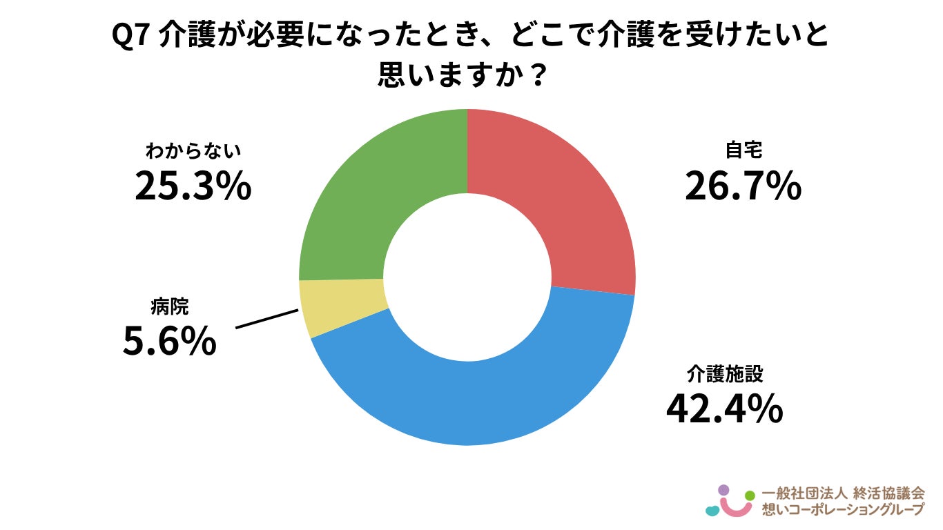 「介護施設」が42.4%で最多となり、「自宅」は26.7%でした。施設での介護を希望する傾向が見られますが、「わからない」と答えた人も25.3%おり、介護の選択肢をまだ検討していない層も一定数存在すると考えられます。
