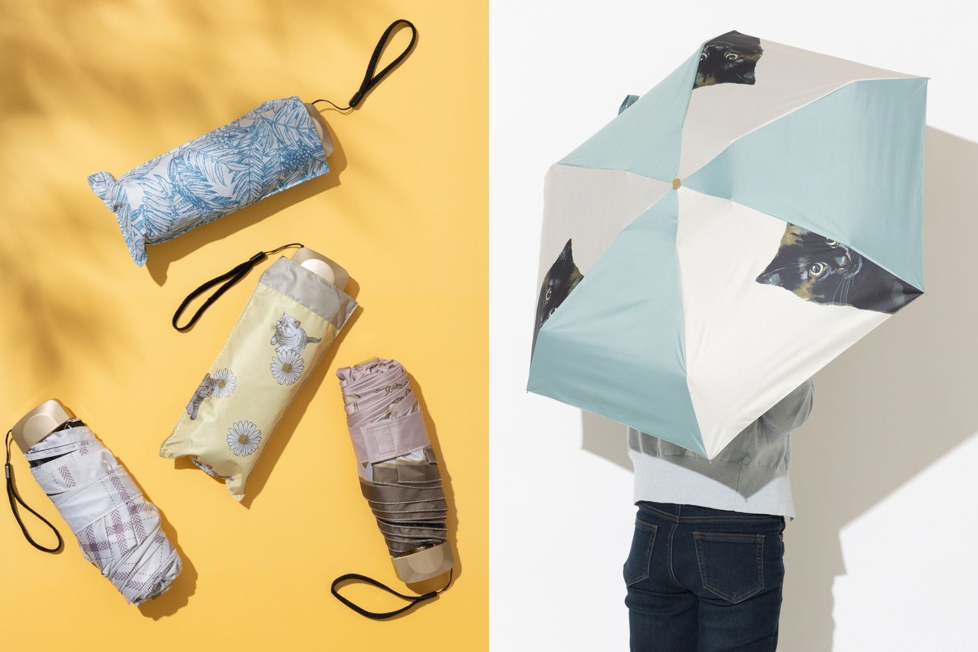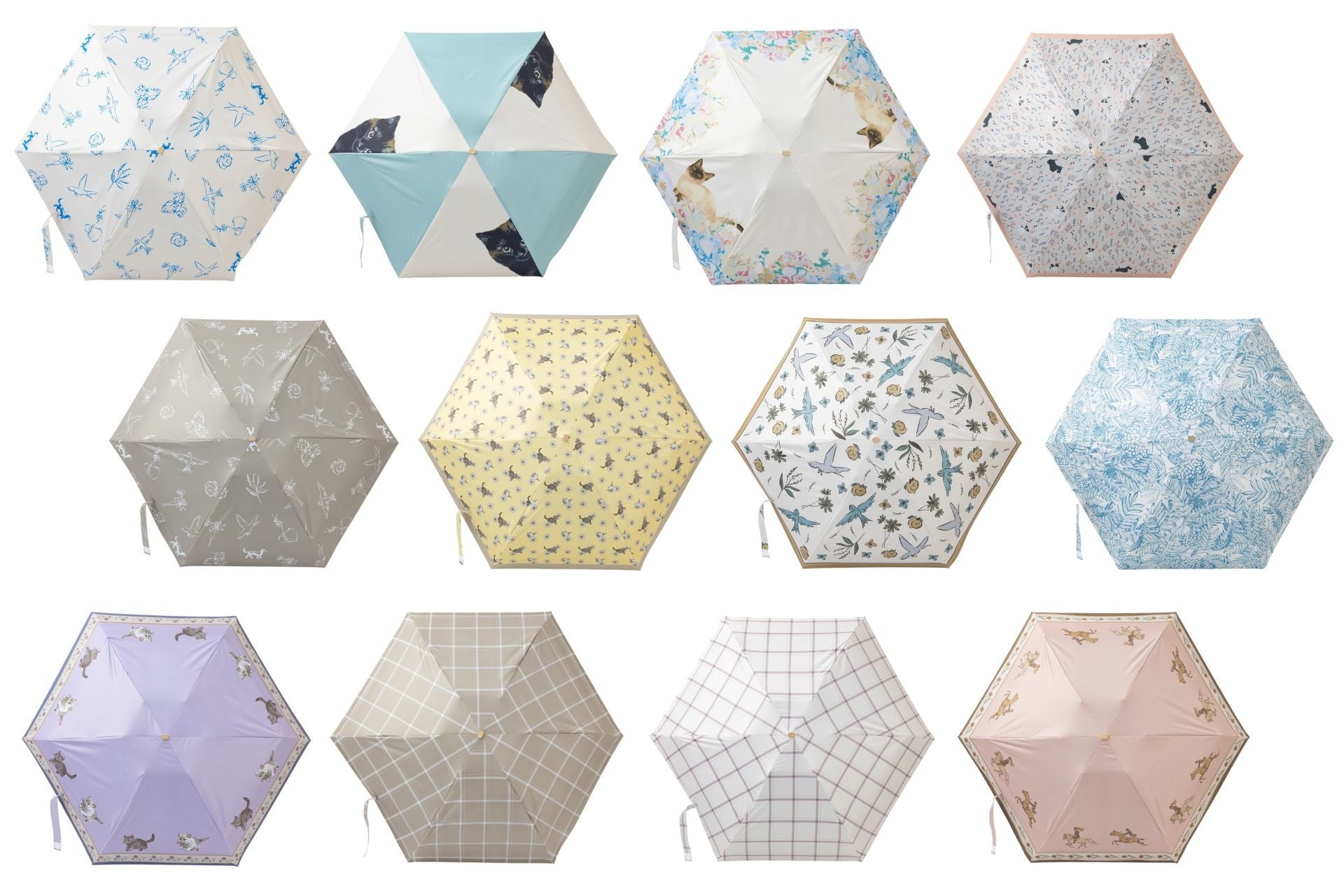 猫ちゃん、小鳥、ボタニカル柄などバリエーション豊かなデザイン折りたたみ傘が新登場。