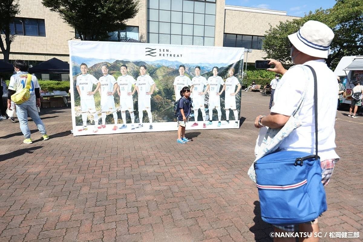 日本ユニストが和歌山の世界遺産・熊野古道で運営する宿「SEN.RETREAT」と、南葛SCの選手がコラボしたパネルを競技場前に設置。この日限りのパネルということもあり、お子様から大人まで写真を撮影する姿が見られました。