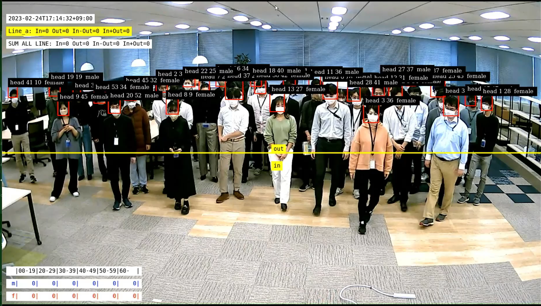 マスク着用時の検知、同一人物の重複カウントの防止、30人以上の同時検知など、高い精度での人物カウントや属性の推定を可能としています。