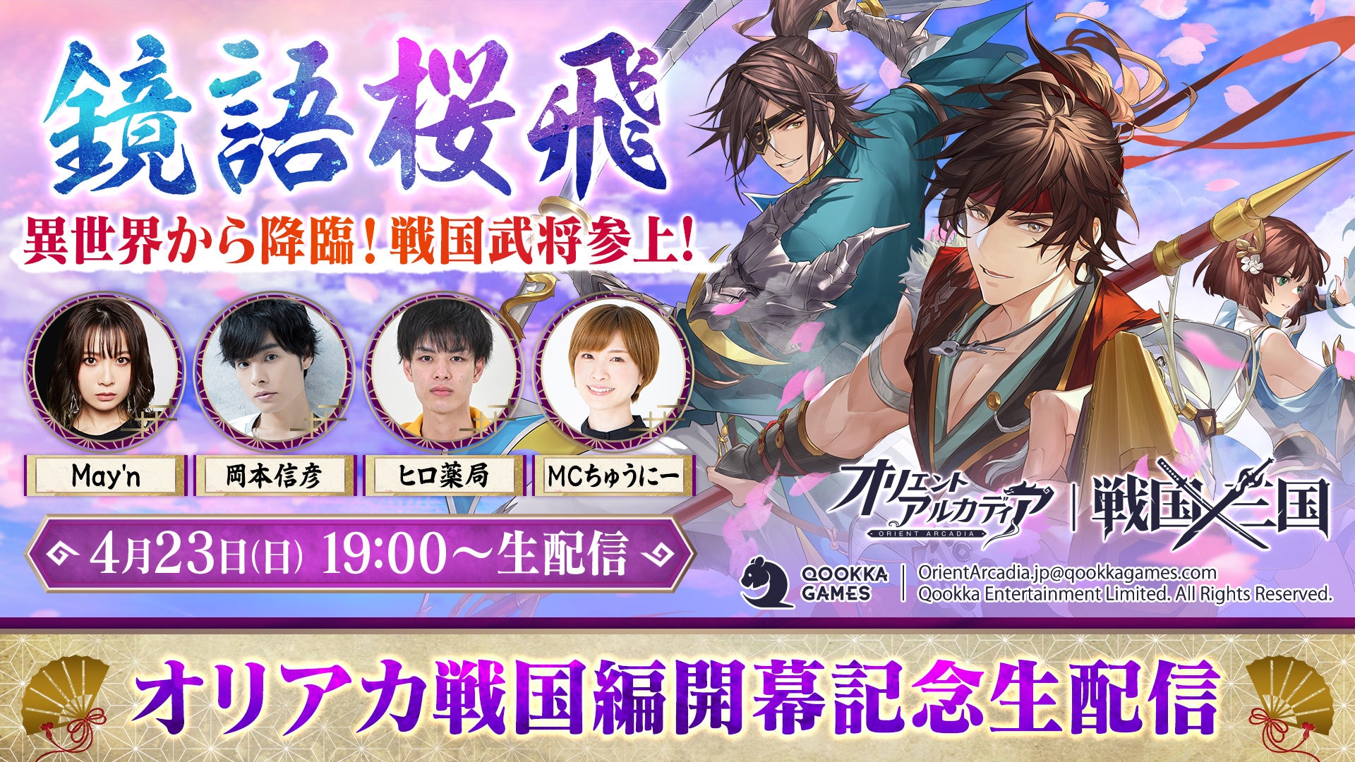 戦国編開幕を記念し、2023年4月23日(日)19時より、公式YouTubeチャンネルや公式Twitterアカウント(@Oriaka_JP)にて生配信の実施を決定しました。今回は戦国編テーマソング『破鏡重縁』作詞・作曲・歌手のMay’nさん、真田幸村を演じる岡本信彦さん、ファミ通Appスターズのヒロ薬局さんもゲストに迎え、MCはちゅうにーさんが務めてくださいます。生配信では、一周年で白熱していた人気投票結果の発表に加え、戦国英雄の最新情報も明らかになります。さらに、生配信中でグッズの抽選や豪華視聴特典を入れた交換コードの発表も行いますので、ぜひご覧ください!