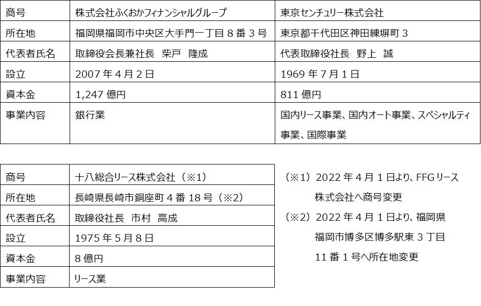 | (1) | FFGにおけるリース事業拡大(営業エリア拡大やサービスメニューの拡充)に向けた、東京センチュリーによる営業面を中心としたサポートやノウハウの提供 |