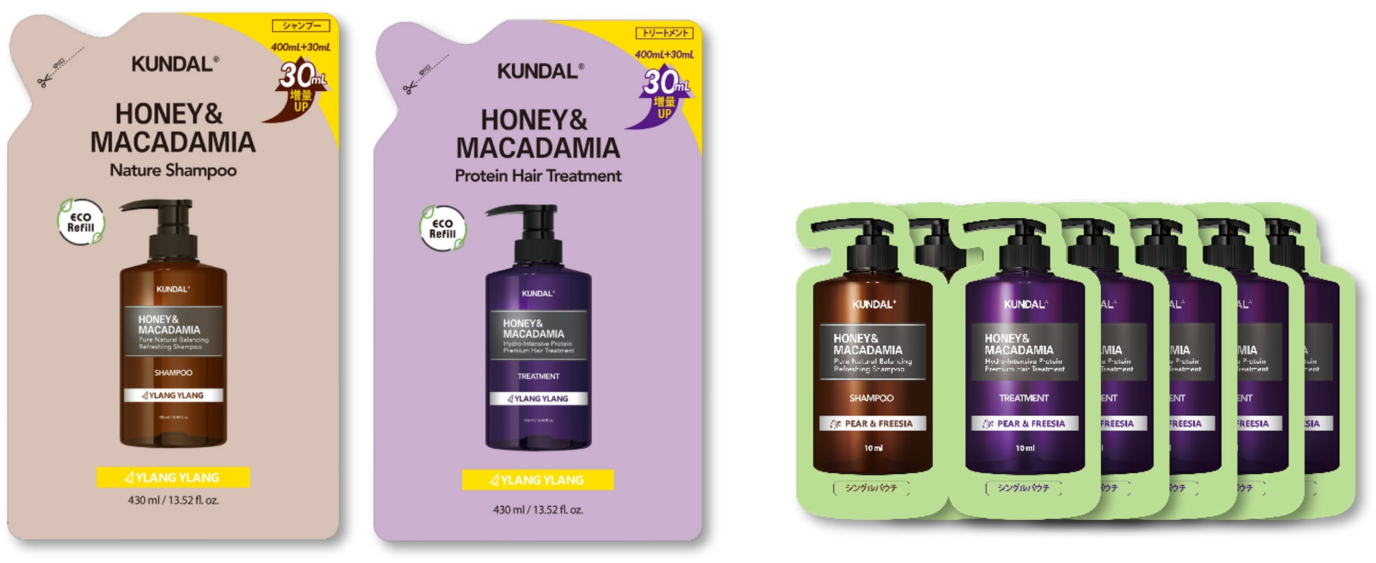 韓国では国民的人気とも言われる「クンダルH&Mシャンプー/トリートメント」はその香りの豊かさでも知られていますが、今回はその中でも最も支持の高い“イランイランの香り”のリフィルに加え、今年3月に日本に上陸したばかりの“ペアー&フリージアの香り”の1回用パウチ5つをセットにしました。華やかな新しい香りをしっかりお試しいただけます。