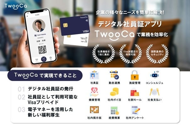 「TwooCa」は、電子決済や社員間送金、福利厚生ポイントの付与や経費精算といった機能を備えたVisa決済機能付き社員証です。また、企業の課題に応じて機能やサービスのカスタマイズも可能です。
