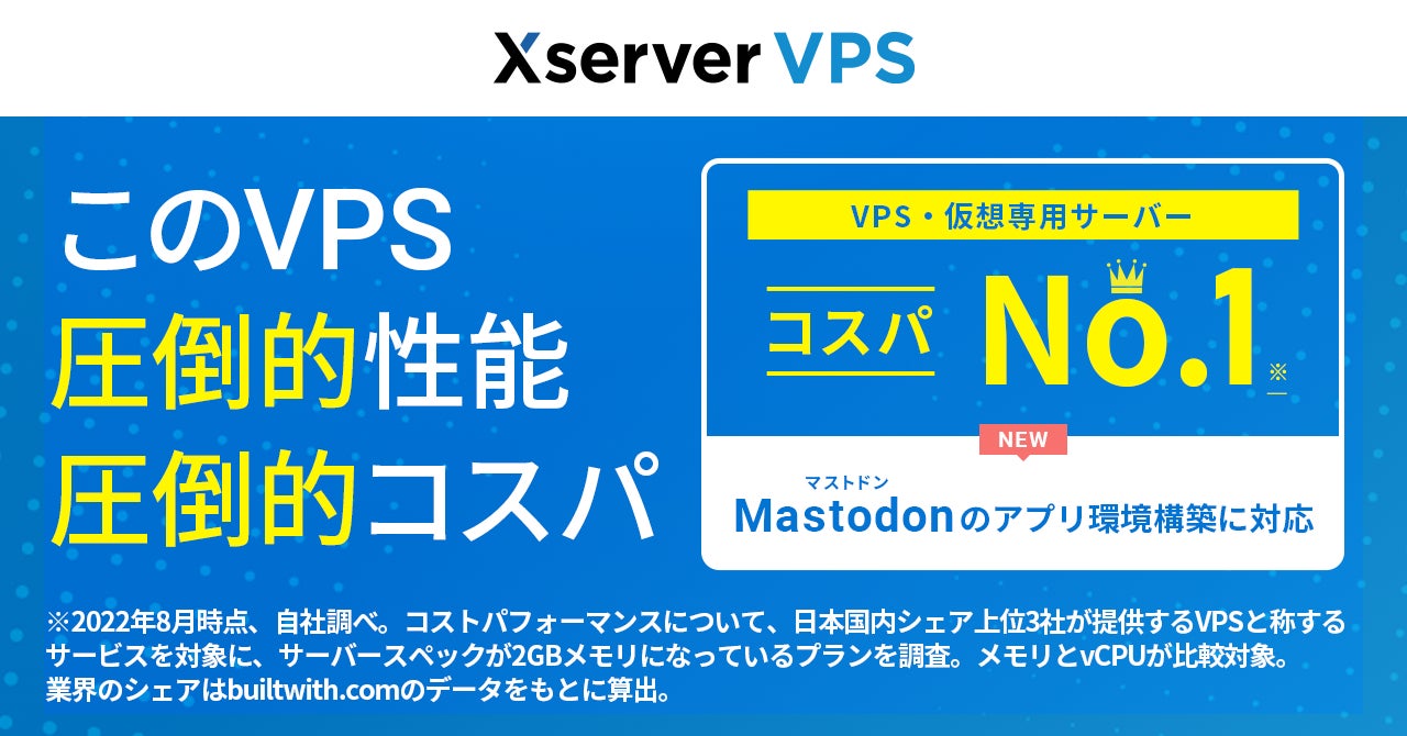 ホスティング大手のエックスサーバー、仮想専用サーバー『Xserver VPS』でアプリケーションイメージに「Mastodon(マストドン)」を追加