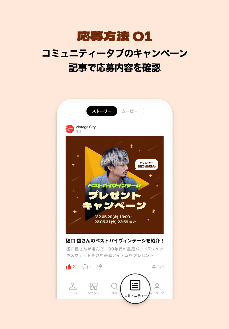 日本初のヴィンテージ・ファッション・アプリ「Vintage.City(ヴィンテージ・シティ)」内の「コミュニティ」ページに公開される「キャンペーン記事」で応募内容を確認