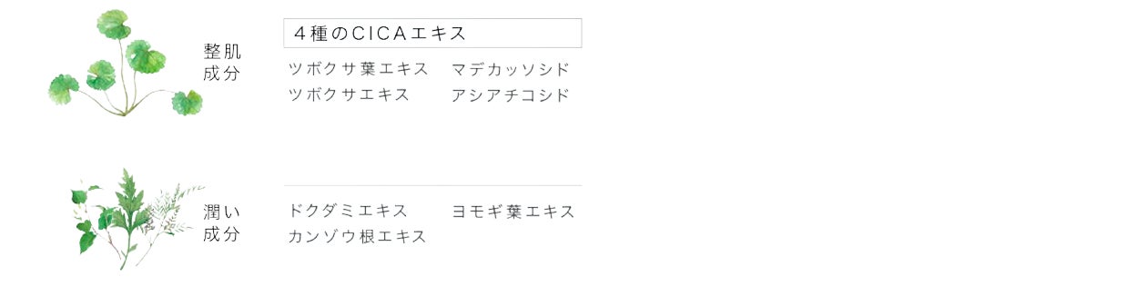肌荒れを防ぐCICAエキス*1と肌の潤いを保ちバリア機能をサポートするセラミド*2。