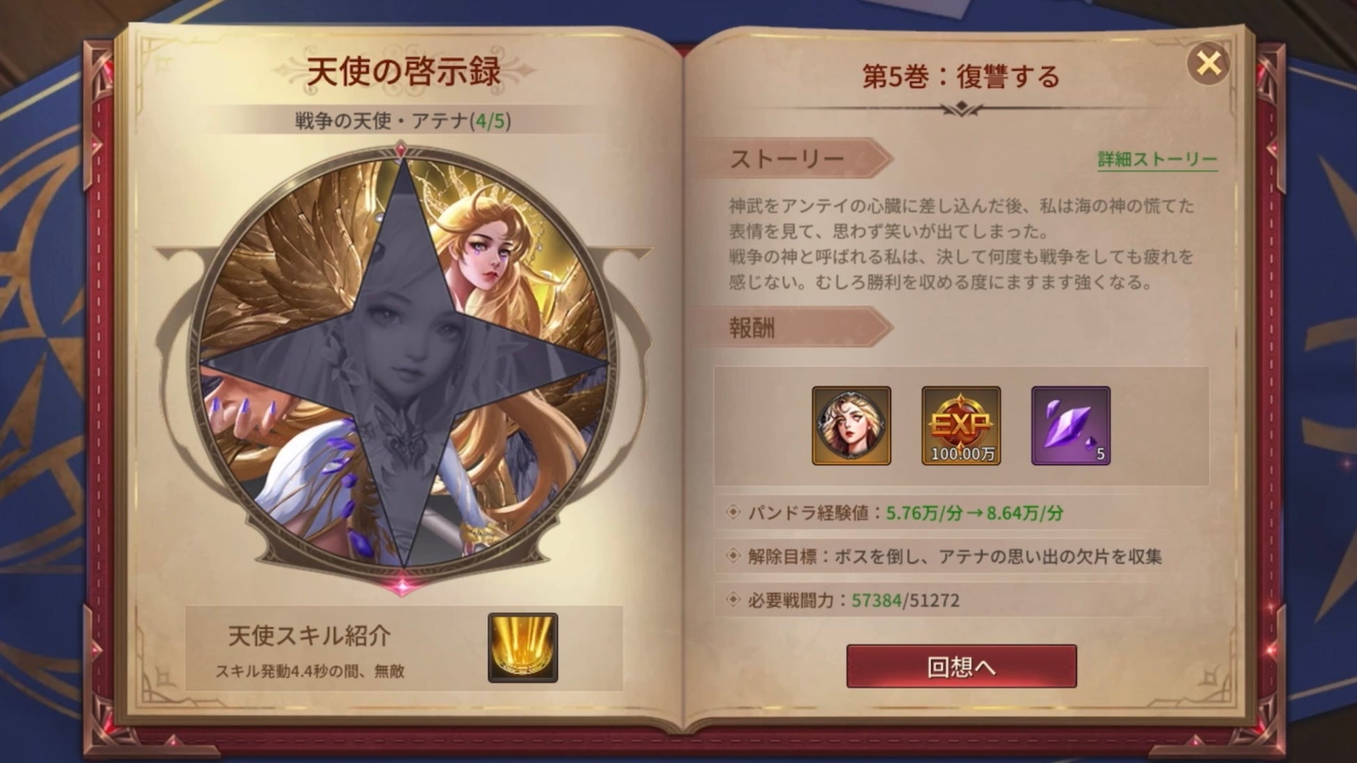 ゲームを開始したら、すぐに放置&ボス討伐を重ね、簡単レベルアップでストーリーを進めていきます。するとストーリーを進め、アテナの「思い出の欠片」を収集することで、「天使の啓示録」のパーツが埋まっていきます。