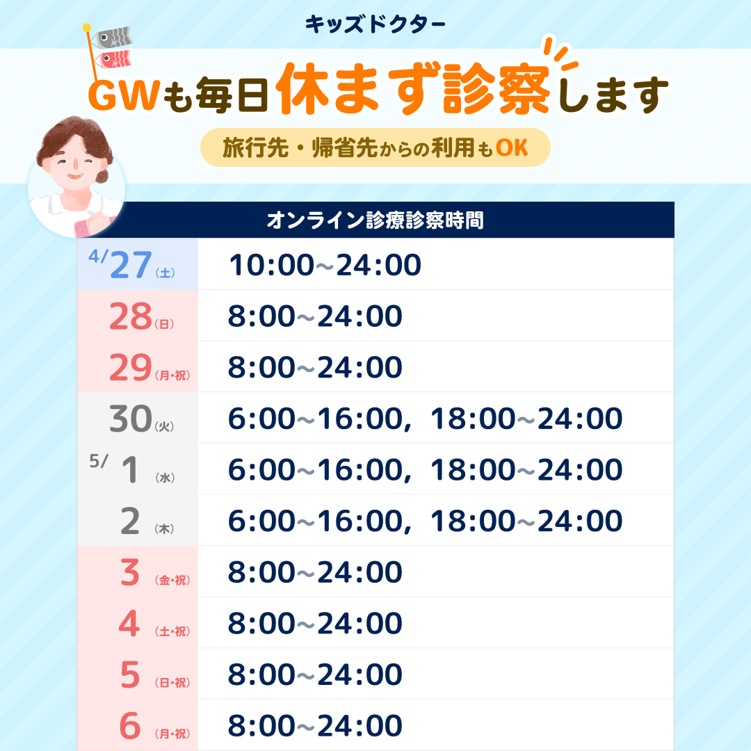 また同じくキッズドクター内で提供している「オンライン診療」は、ゴールデンウィークなどの長期休暇中も毎日休まず診察を行います。かかりつけの病院が休診となることが多い期間の体調不良時にお役に立てると幸いです。