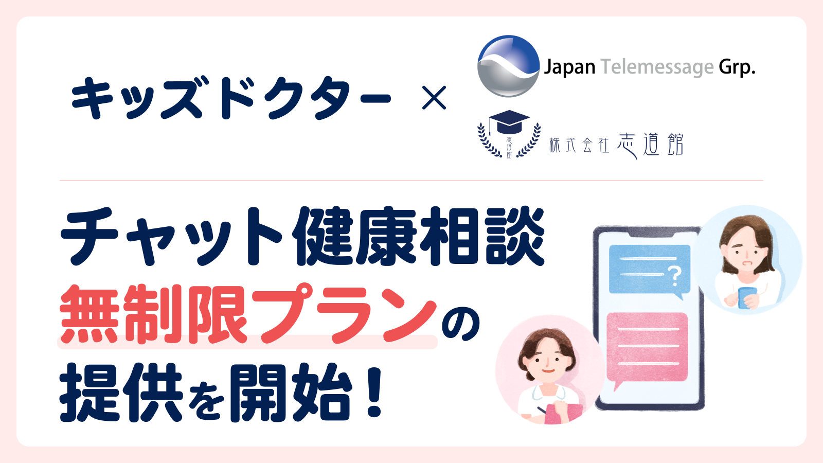 日本テレメッセージのグループ会社であるブロッサムグループ株式会社と株式会社志道館が運営する保育施設に通うご家庭は、子どものオンライン診療アプリ「キッズドクター」内で通常3ヶ月に3回まで無料でご利用いただける「チャット健康相談」が、回数無制限でご利用いただけるようになります。